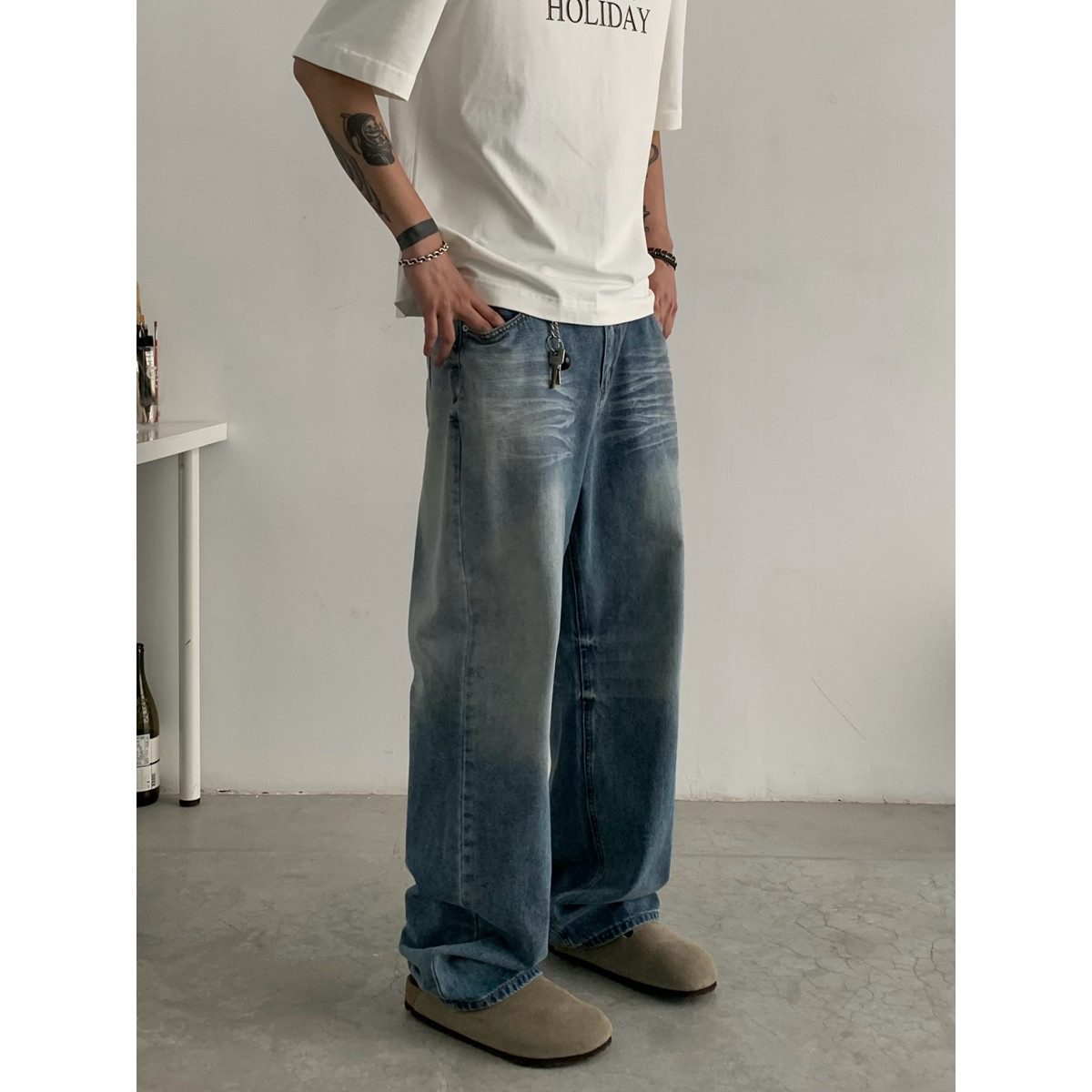 男女潮牌宽松休闲长裤 fit直筒牛仔裤 复古水洗clean INKNOTS美式