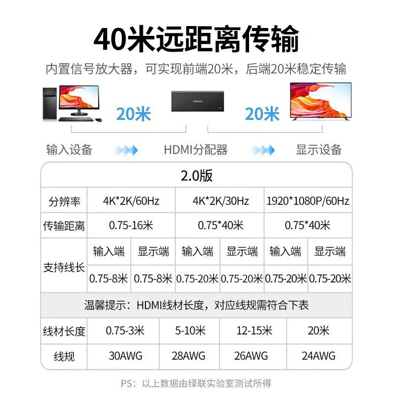 4K1进4出 绿联 一进四出 1.4分配器 高清视频分屏器电脑 HDMI2.0