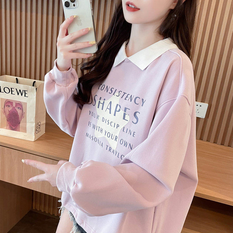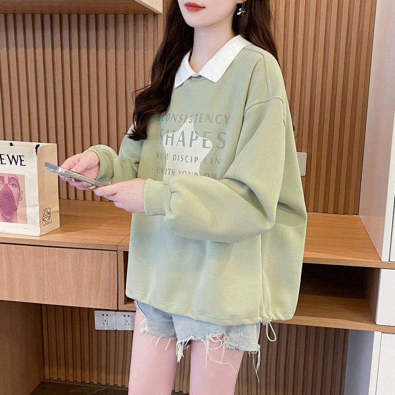 薄款 早秋装 宽松大码 韩版 polo领假两件上衣外套 娃娃领卫衣女春秋季