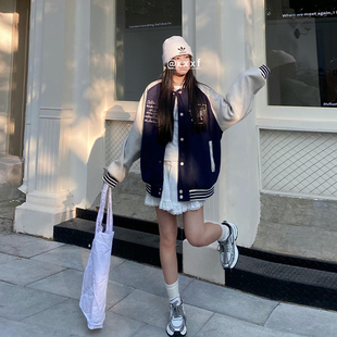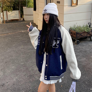 饭饭又饿了韩版 学院风宽松百搭夹克外套 复古英文刺绣棒球服女春季