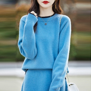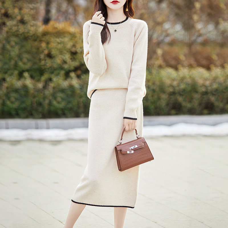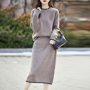 裙子 针织套装 100%纯羊毛衫 女圆领拼色毛衣半身裙两件套宽松羊绒衫