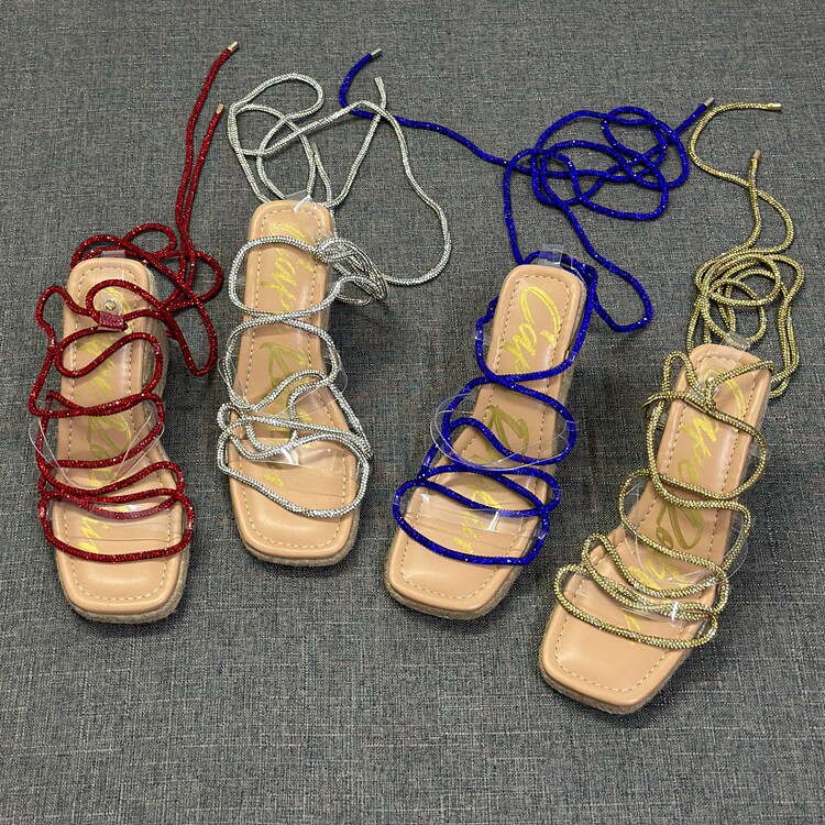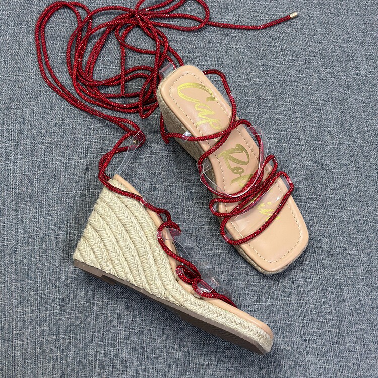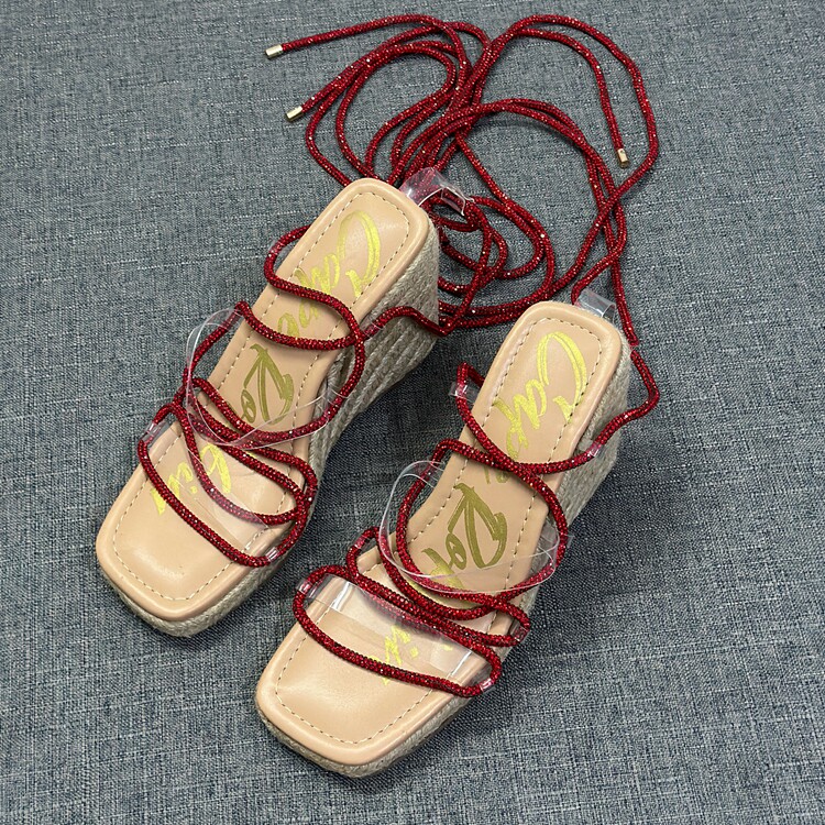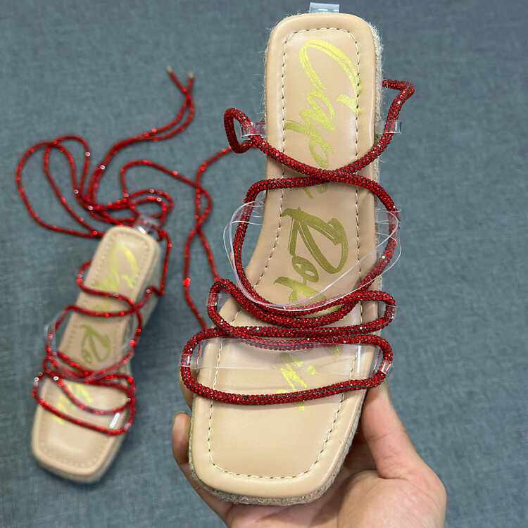 方头露趾水钻脚环系带罗马鞋 新款 女2024夏季 外贸出口麻绳坡跟凉鞋