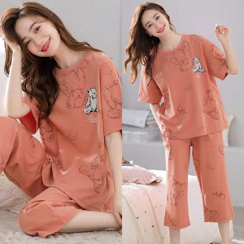 可外穿夏天休闲全棉家居服套装 100%纯棉短袖 七分裤 薄款 睡衣女夏季