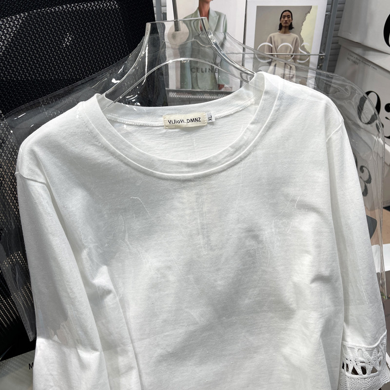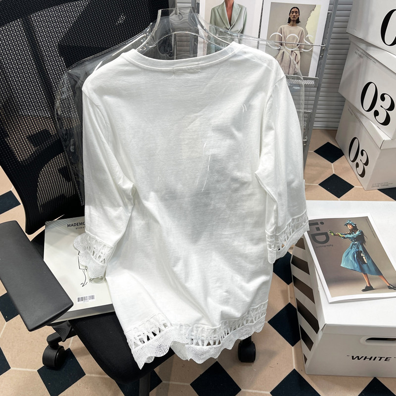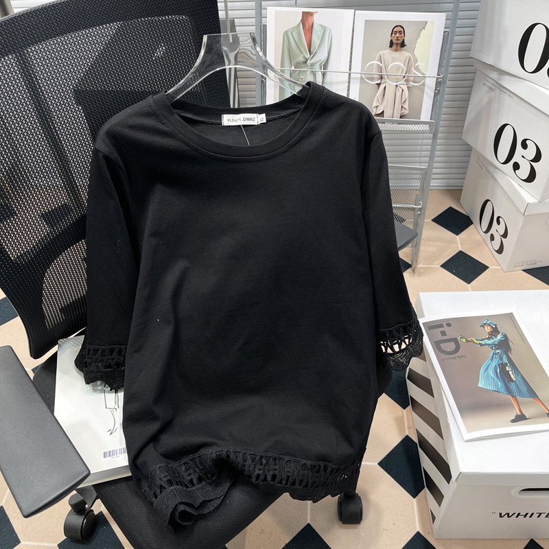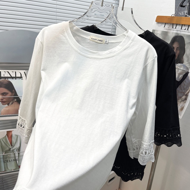 上衣 拼接镂空蕾丝显瘦百搭纯色大码 纯棉T恤女胖mm韩版 宽松九分袖