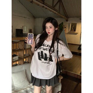 体恤上衣 别致猫咪印花宽松显瘦休闲半袖 正肩纯棉短袖 V领T恤女夏季