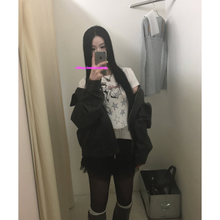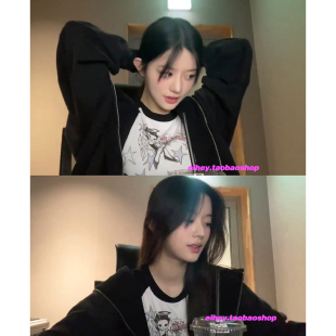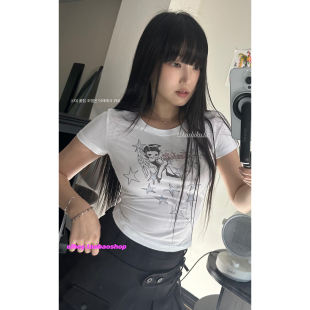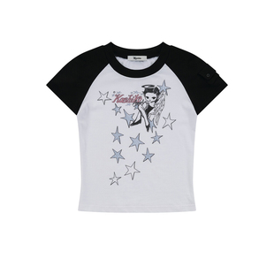eihey诶嘿Minju同款 T恤圆领黑白撞色百搭上衣 美少女星星印花短袖