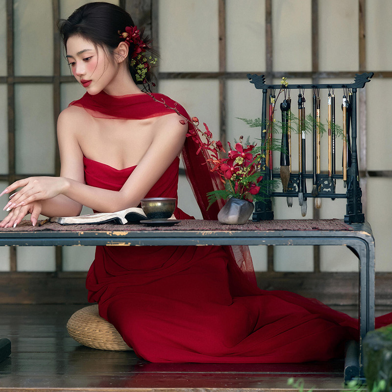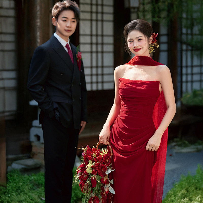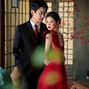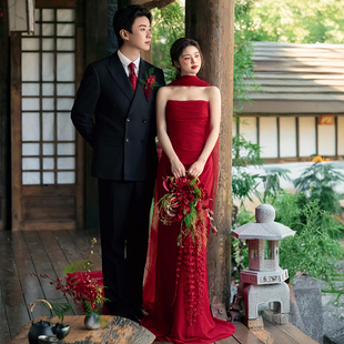 影楼拍照主题服装 红色复古街拍喜嫁晨袍情侣鱼尾抹胸婚纱礼服 新款