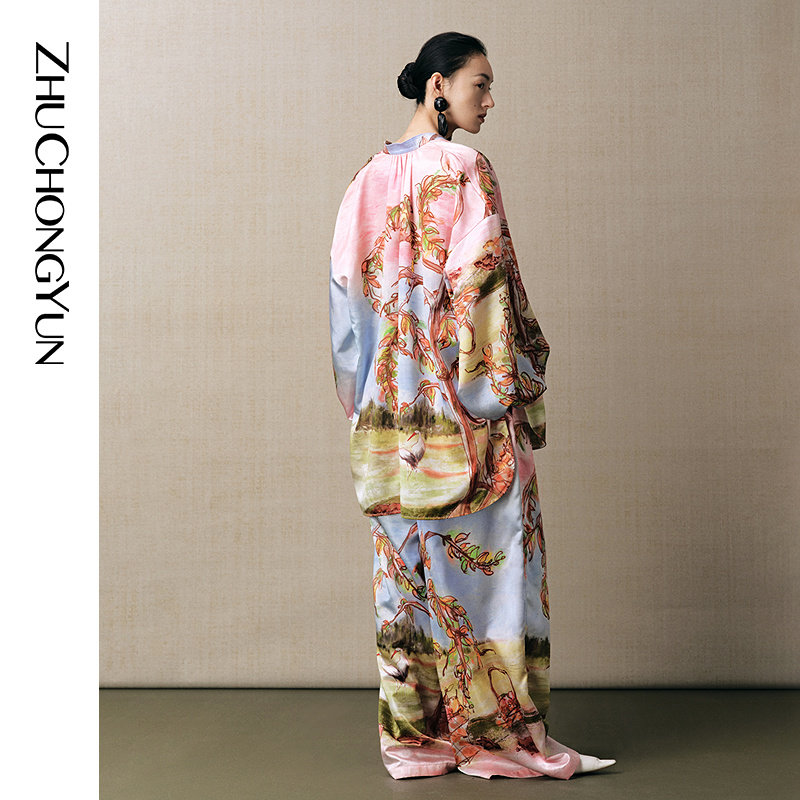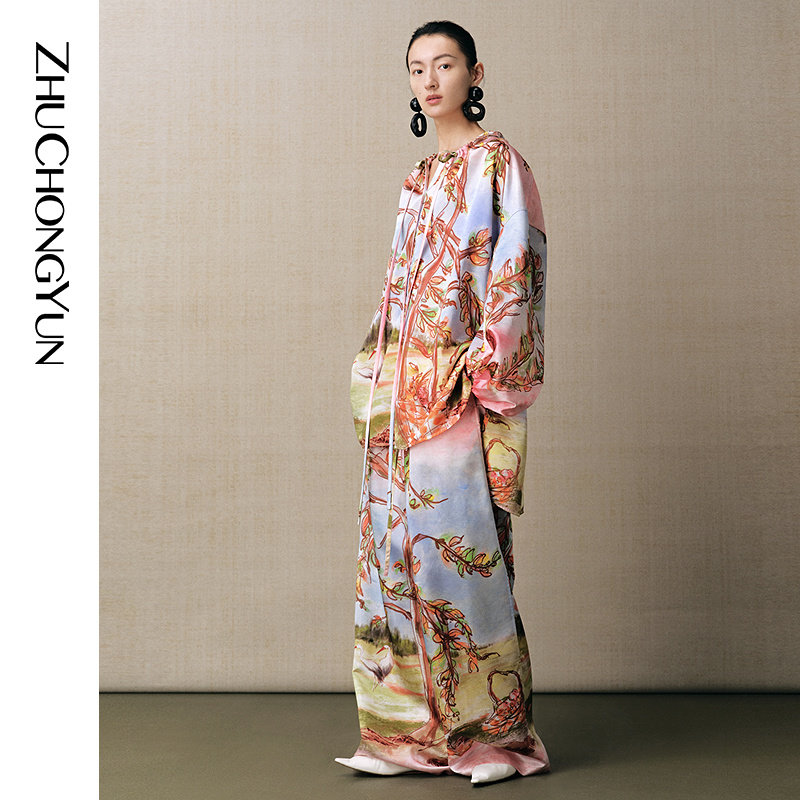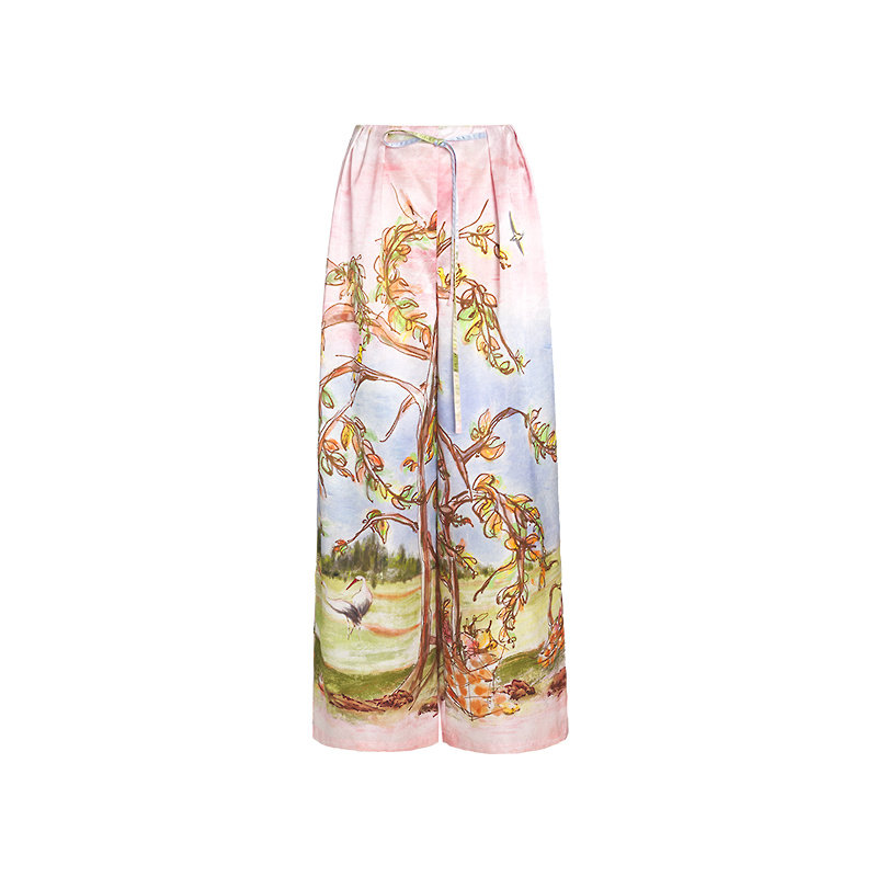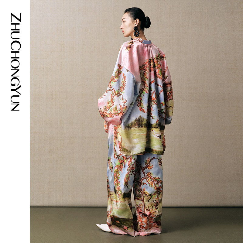 真丝中式 ZHUCHONGYUN夏新品 印花阔腿长裤 陶韵鹳彩
