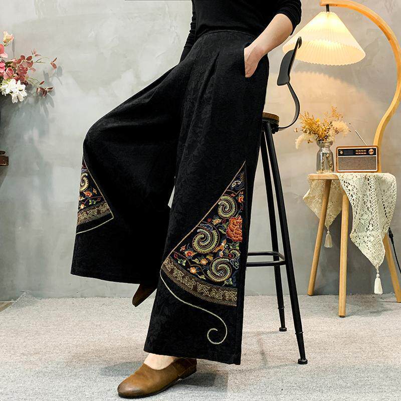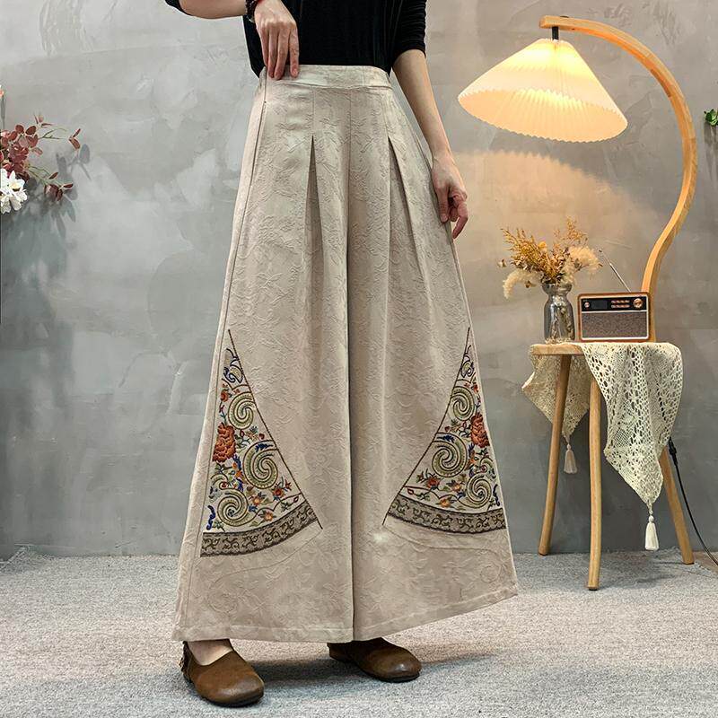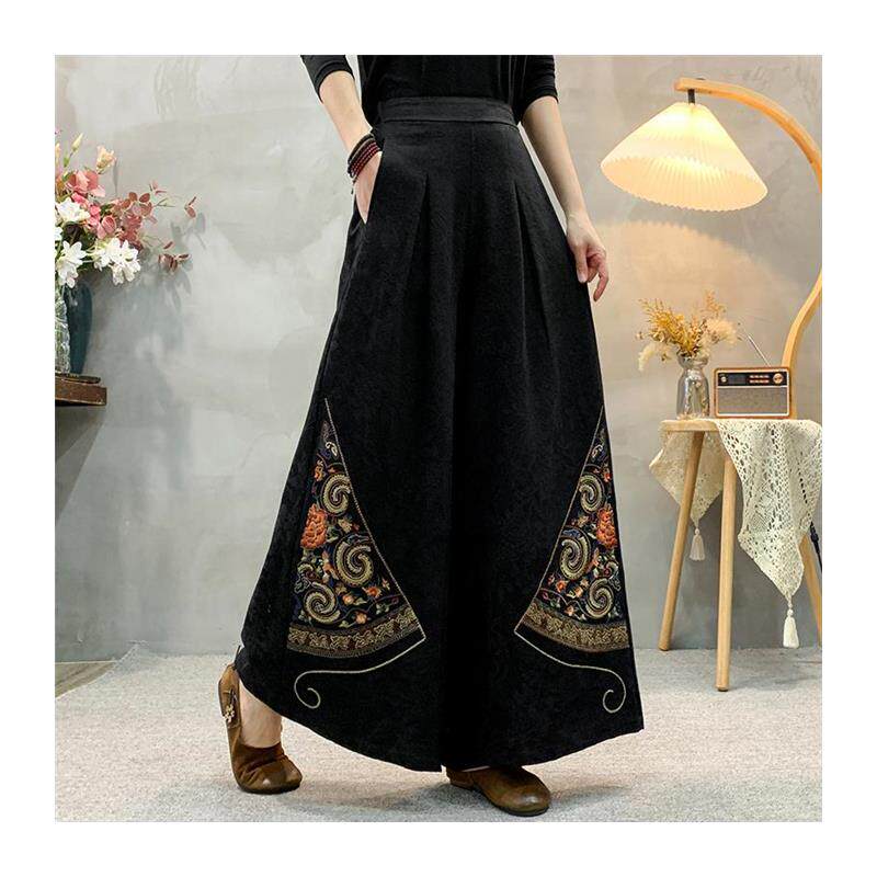 民族风大腿裤 妈妈春季 重工刺绣休闲百搭大码 棉麻提花阔腿裤 女 新款