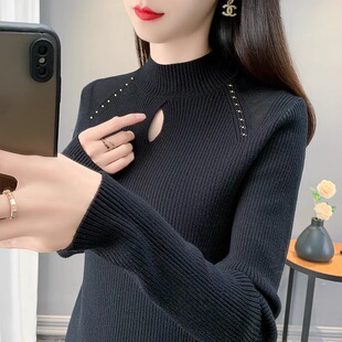 大码 半高领钉珠内搭针织上衣女士秋冬洋气减龄镂空设计感毛衣 女装