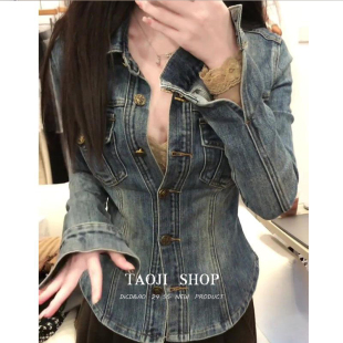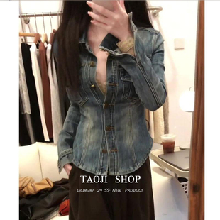 高级感收腰修身 美式 秋季 女装 显瘦外套上衣 复古蓝色polo领牛仔衬衫