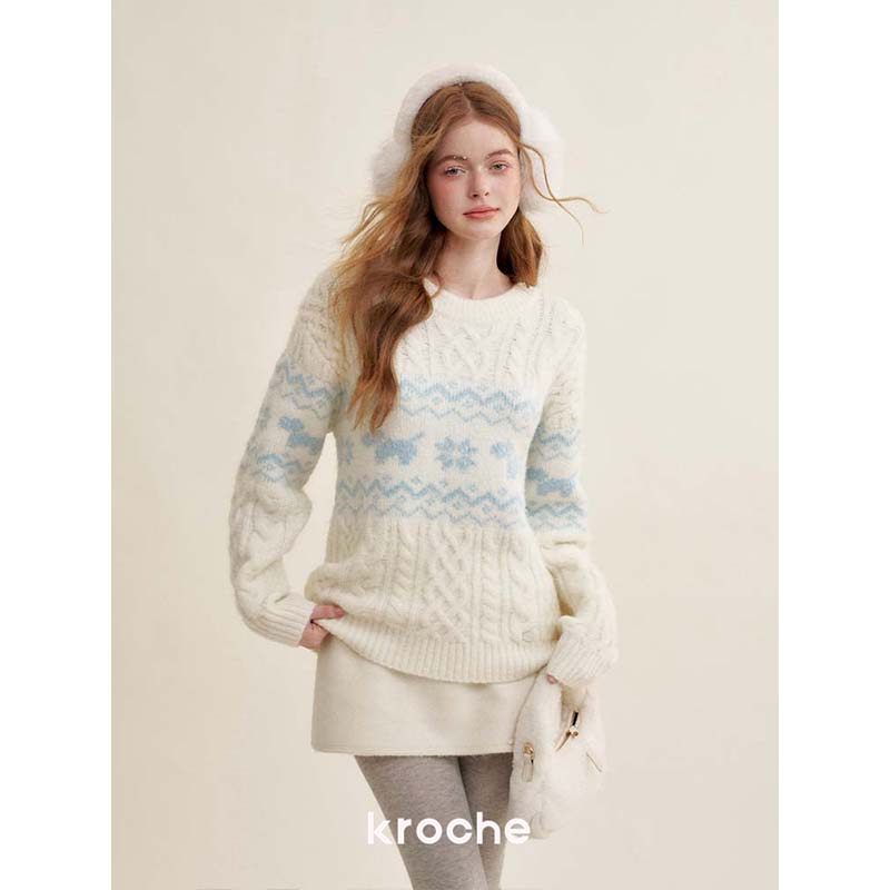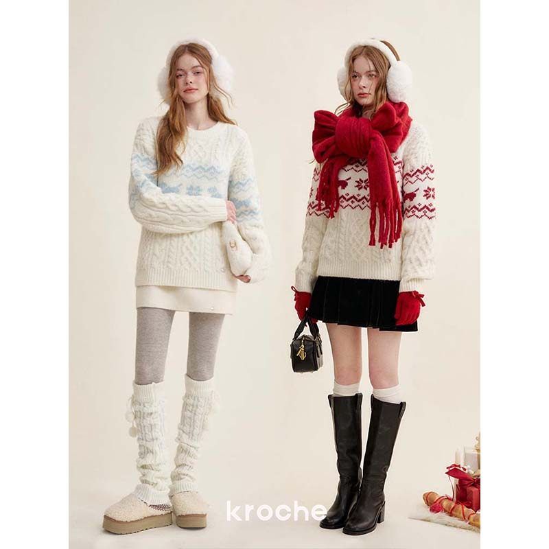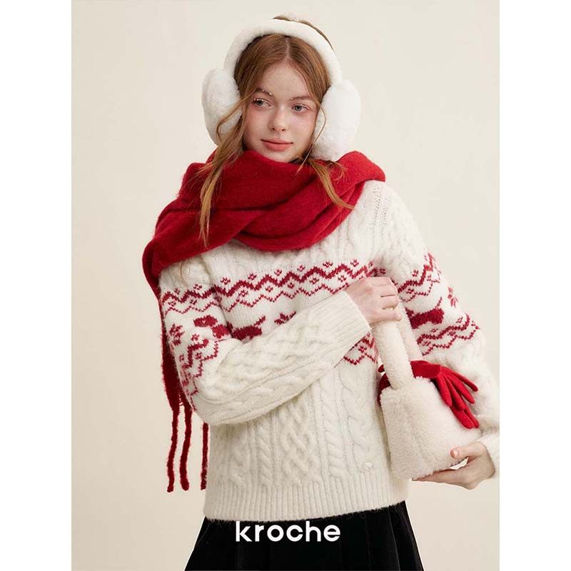 费尔岛羊毛混纺撞色圆领针织衫 圣诞氛围 毛衣 Kroche 赵今麦同款
