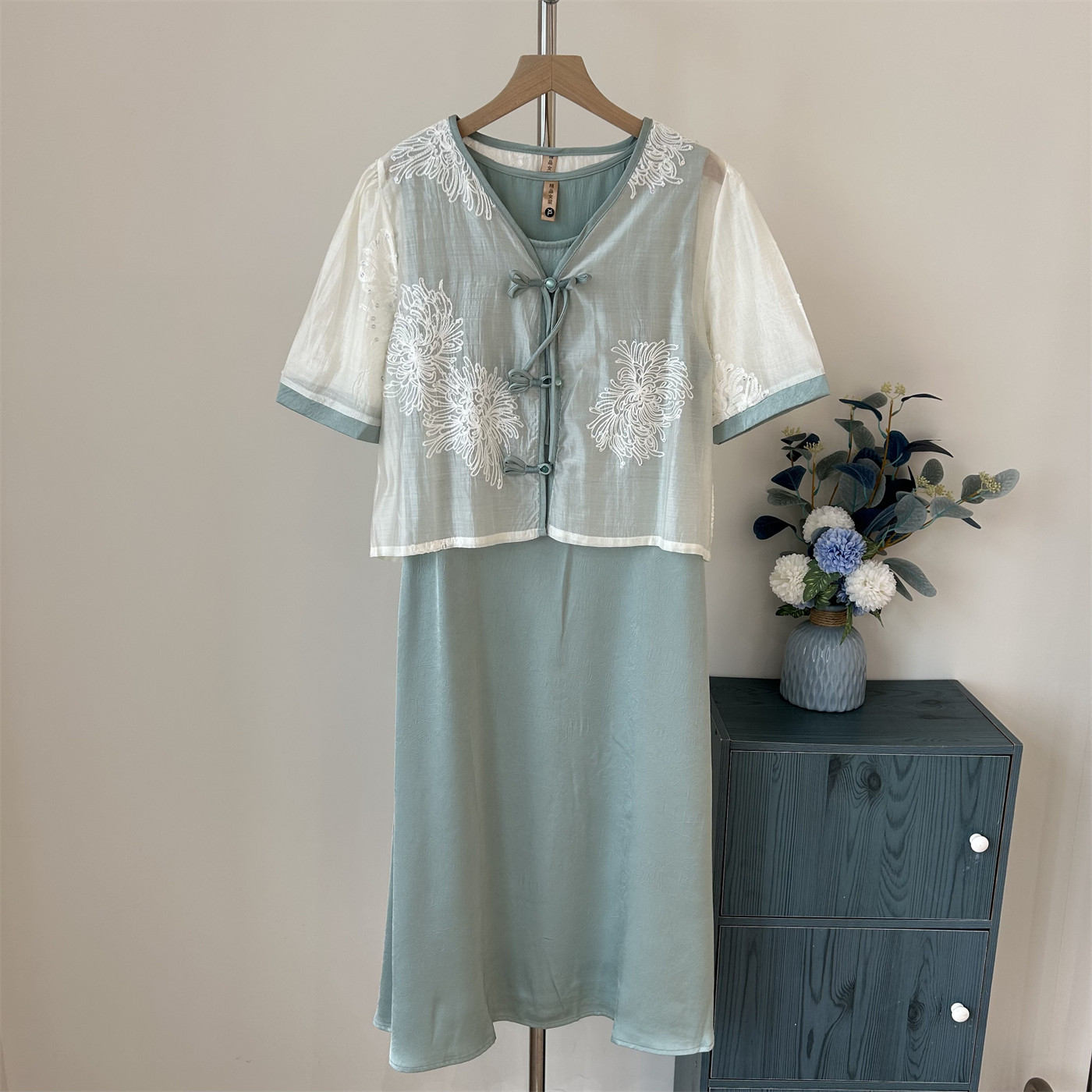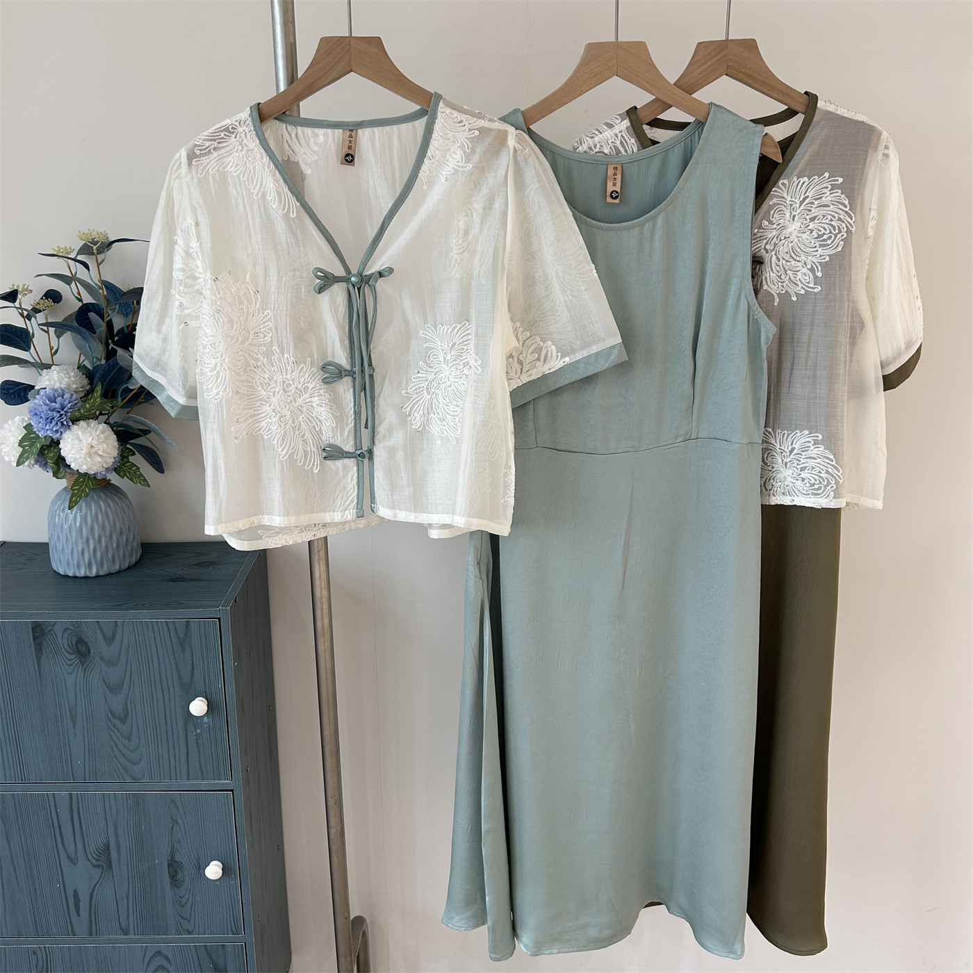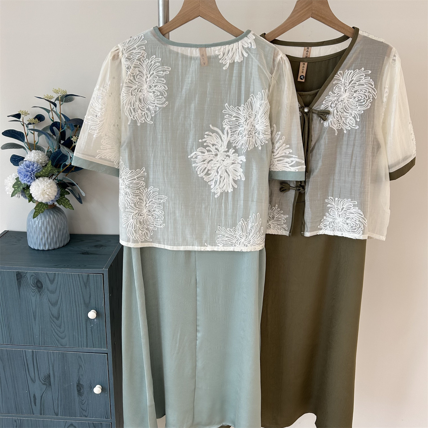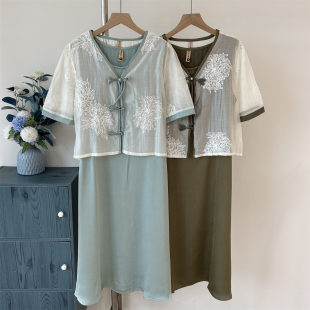 新中式 妈妈夏装 雪纺裙中年女装 短袖 连衣裙两件套 裙子国风高贵大码