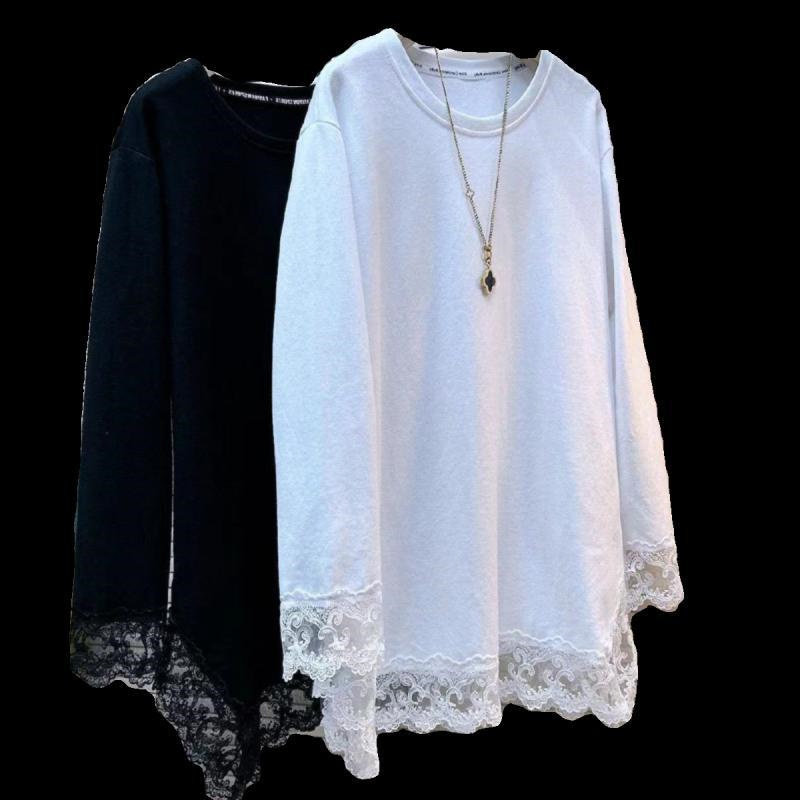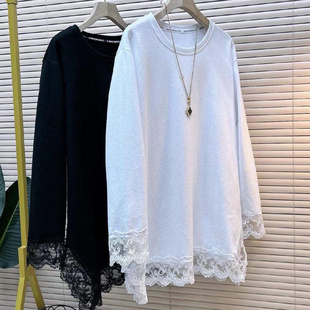 女装 胖MM2 纯色拼接下摆蕾丝花边设计春秋季 长袖 上衣 300斤超大码