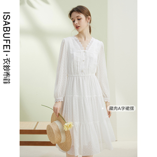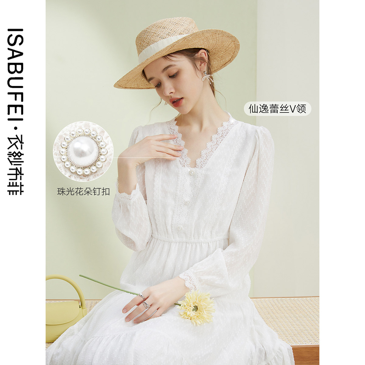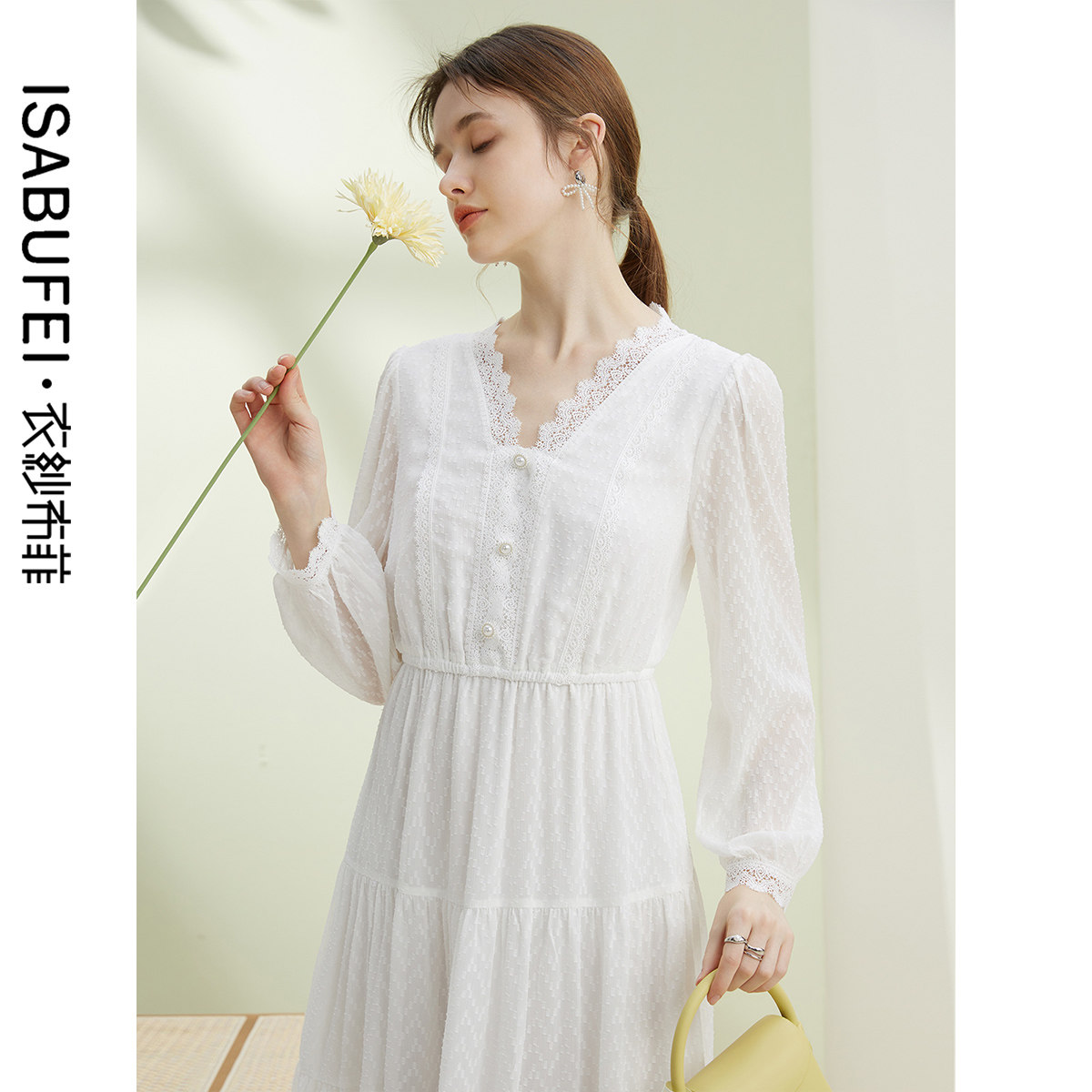 衣纱布菲浅风 女春蕾丝v领收腰白色蛋糕裙 剪花雪纺连衣裙新款
