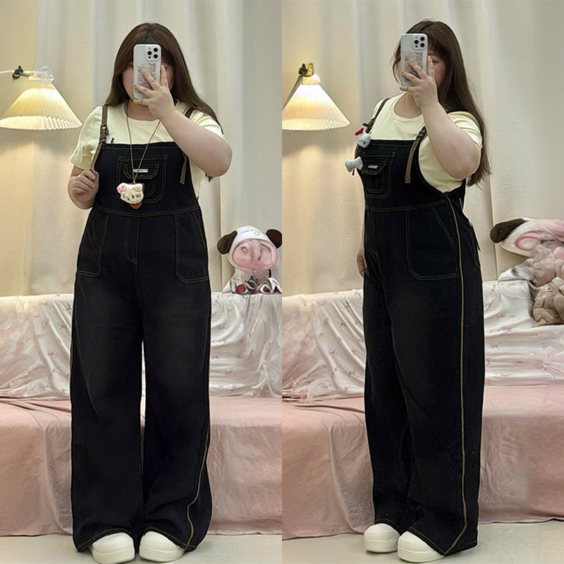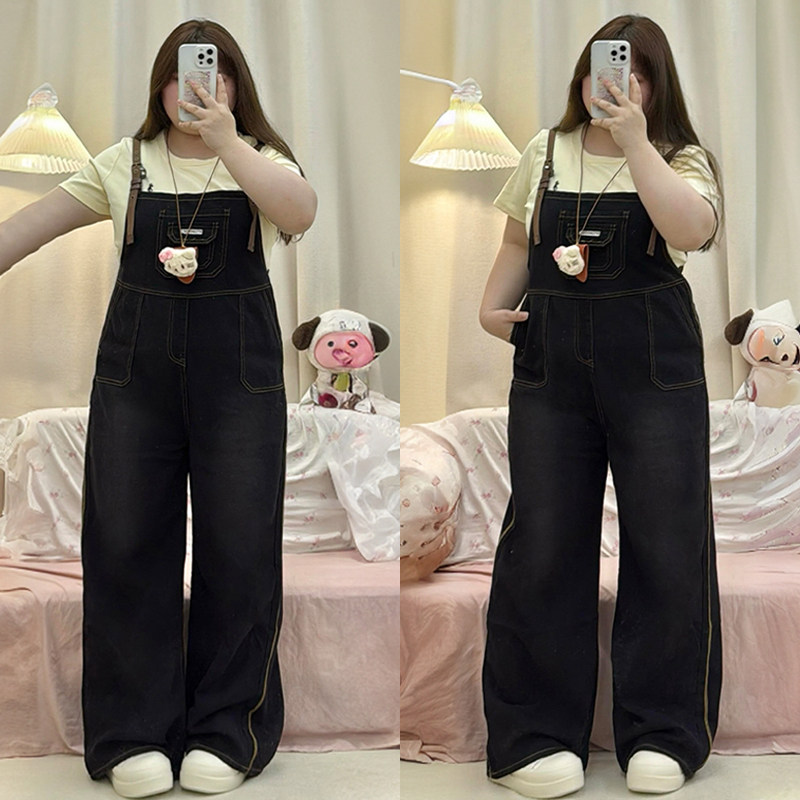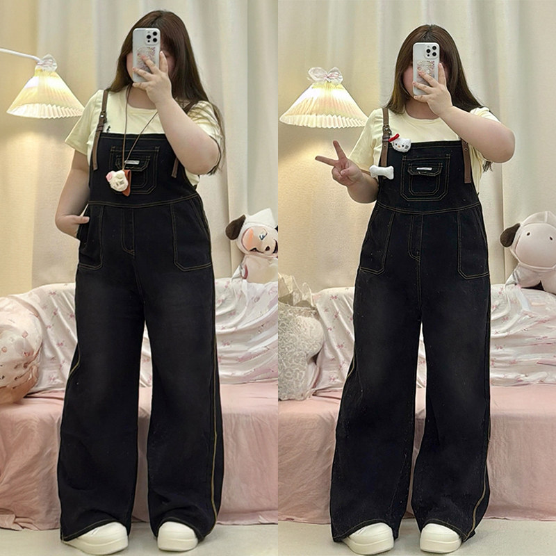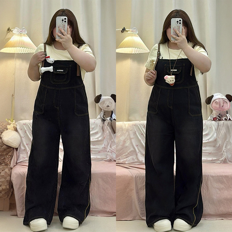 女装 女胖mm梨型遮胯学院风黑色显瘦连体裤 美式 牛仔背带裤 工装 大码