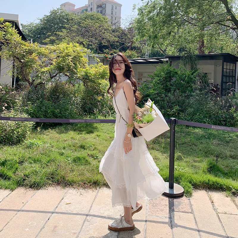 海边度假风蛋糕裙沙滩长裙 新款 曾小咸 白色吊带连衣裙女2024春季