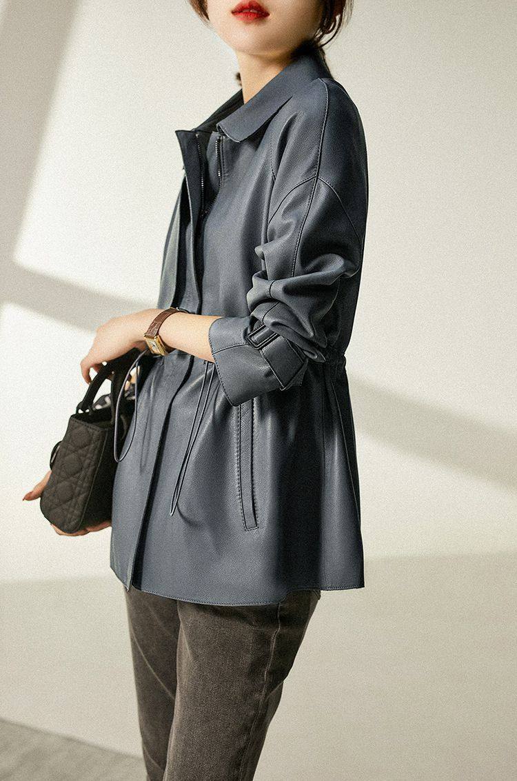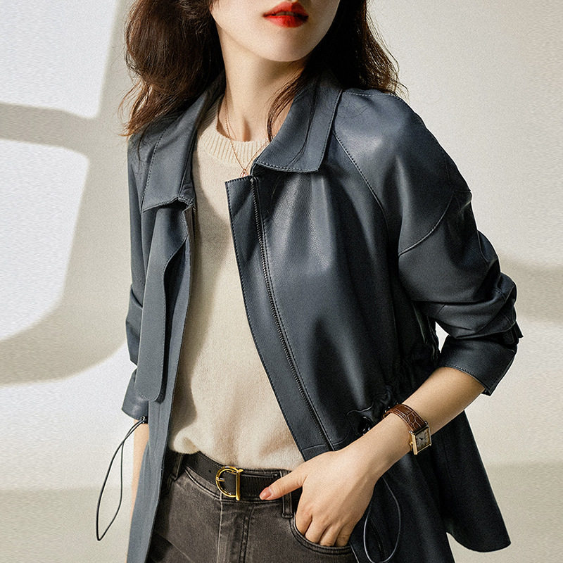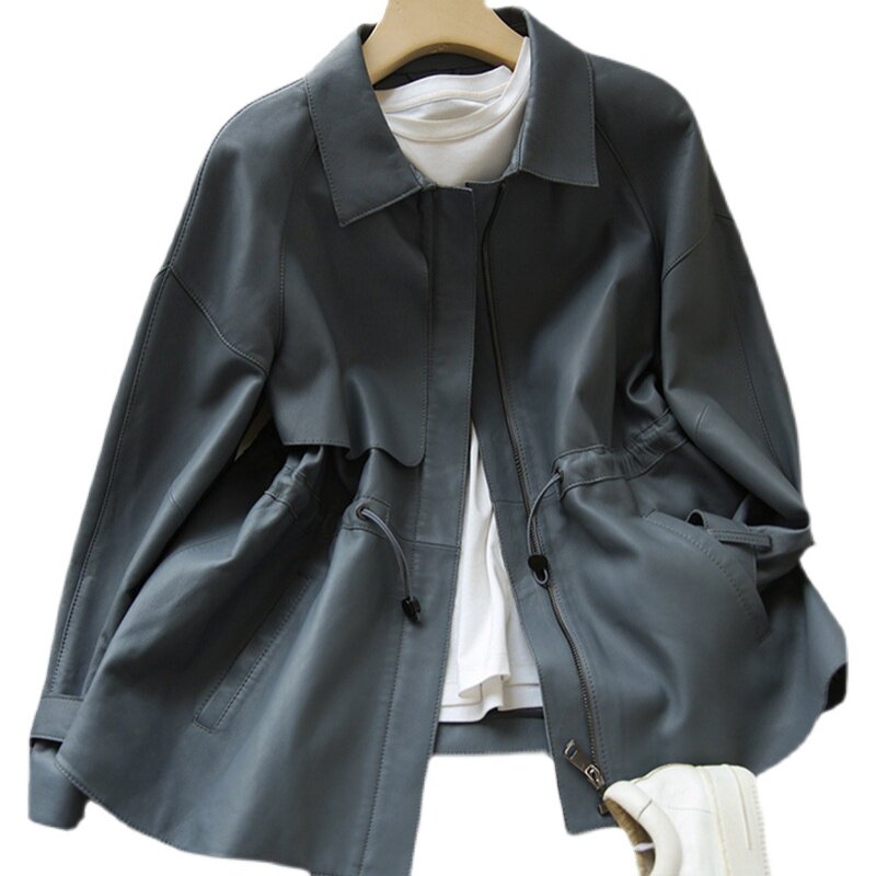 迷雾蓝真皮绵羊皮短款 抽绳收腰宽松皮衣 皮夹克外套女2026春秋新款