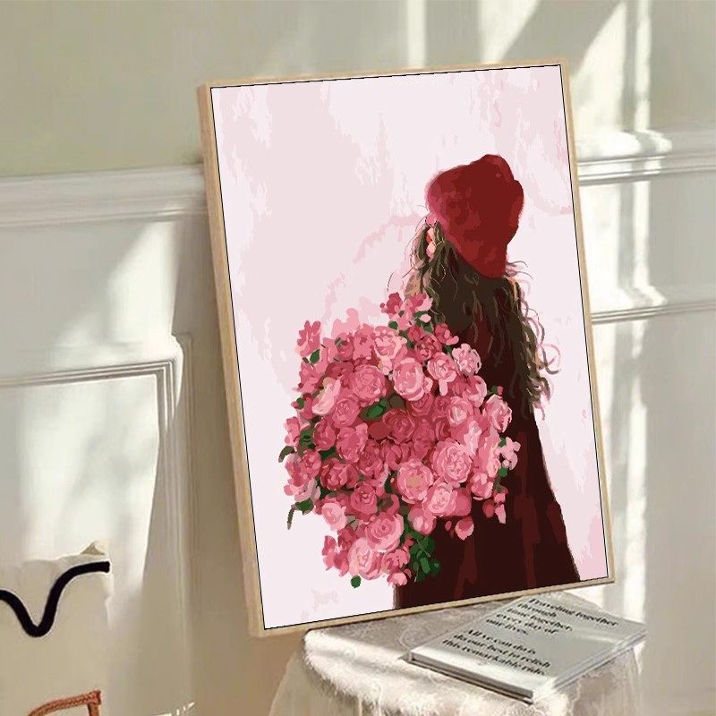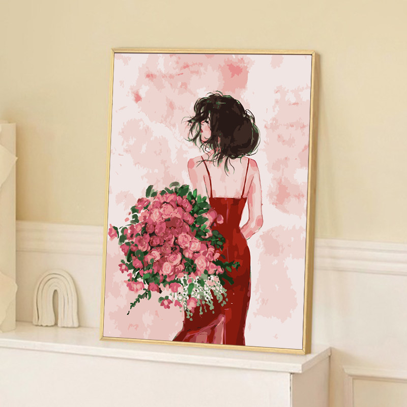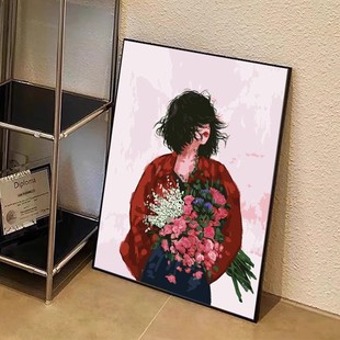 高级感装 饰画捧花少女客厅卧室背景成品油画风喷印小众玫瑰挂摆画
