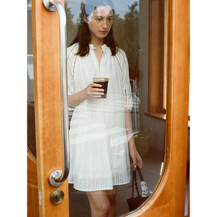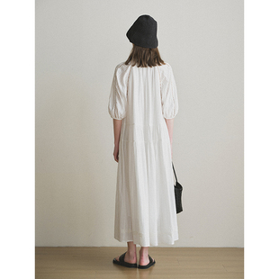 popchrio 连衣裙度假风白色中长短裙子女 别致镂空蕾丝泡泡半中袖