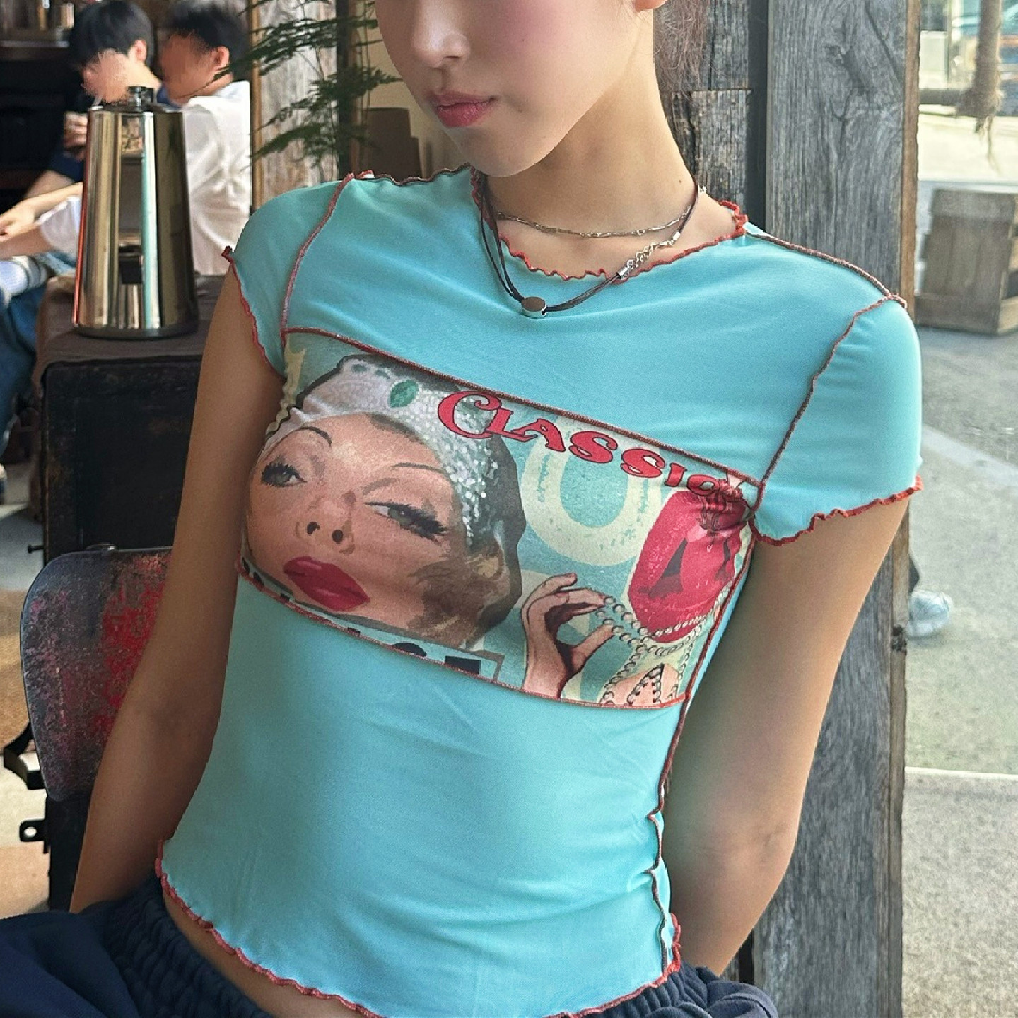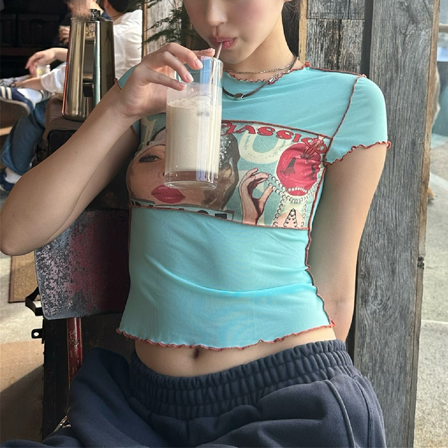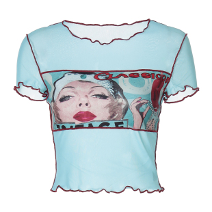 显瘦T恤 辣妹修身 美式 古着感鬼马少女多巴胺印花撞色网纱正肩短袖