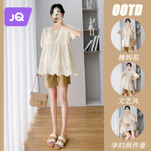 夏季 两件套装 薄款 t恤宽松上衣孕妇短裤 蕾丝镂空短袖 婧麒孕妇夏装