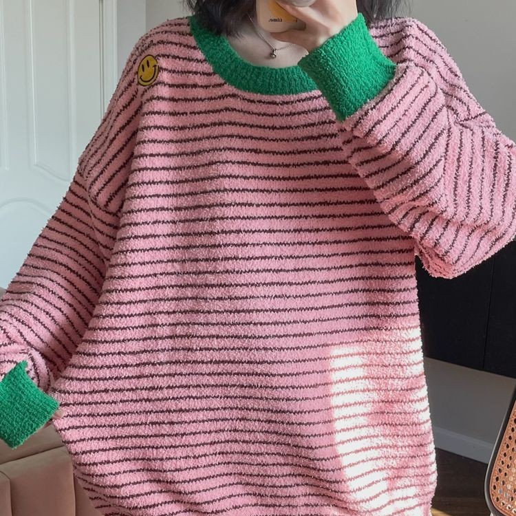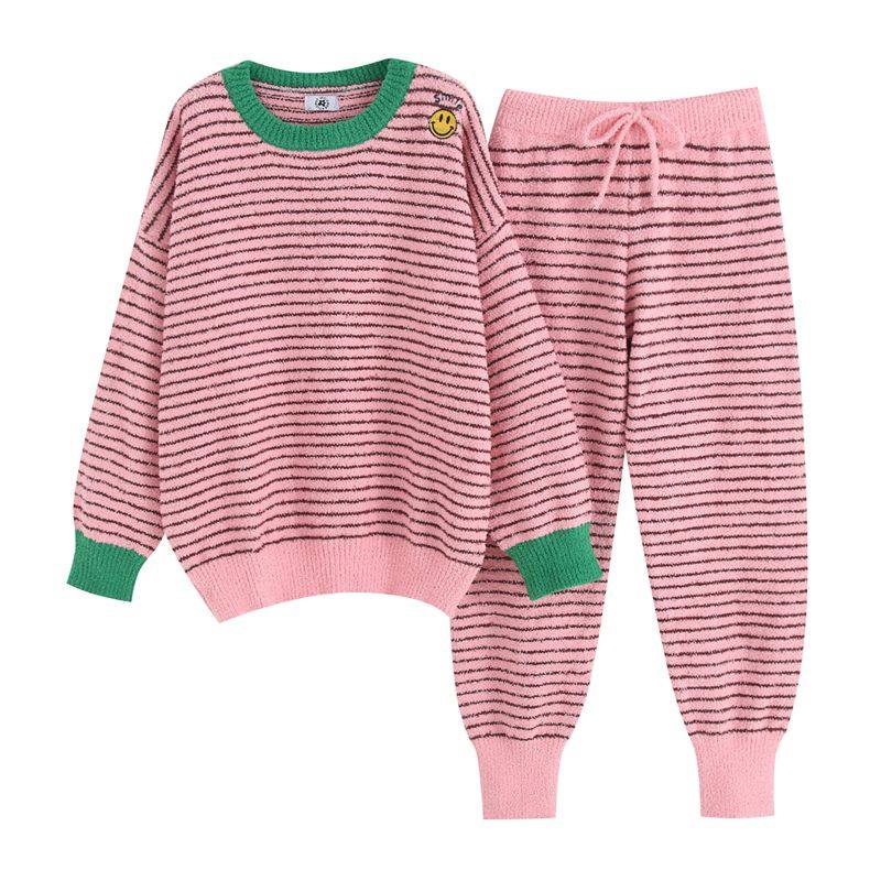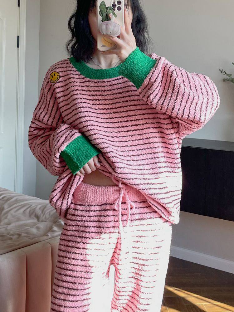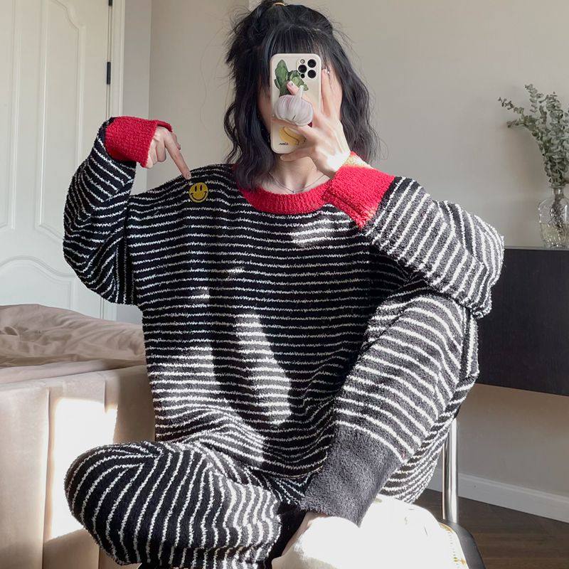 HEARMES 加厚珊瑚绒保暖可外穿家居服 条纹笑脸软绵绵睡衣女士冬季