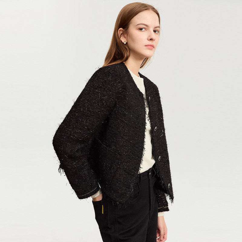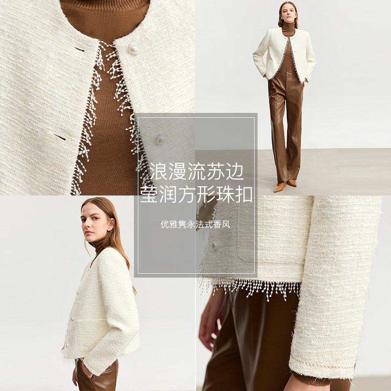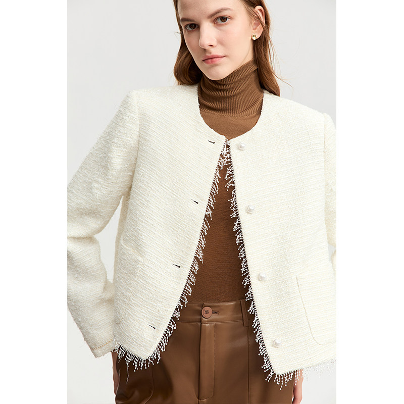 Amii2026冬新款 香风仿珍珠扣粗花呢外套女圆领流苏边箱型上衣 经典