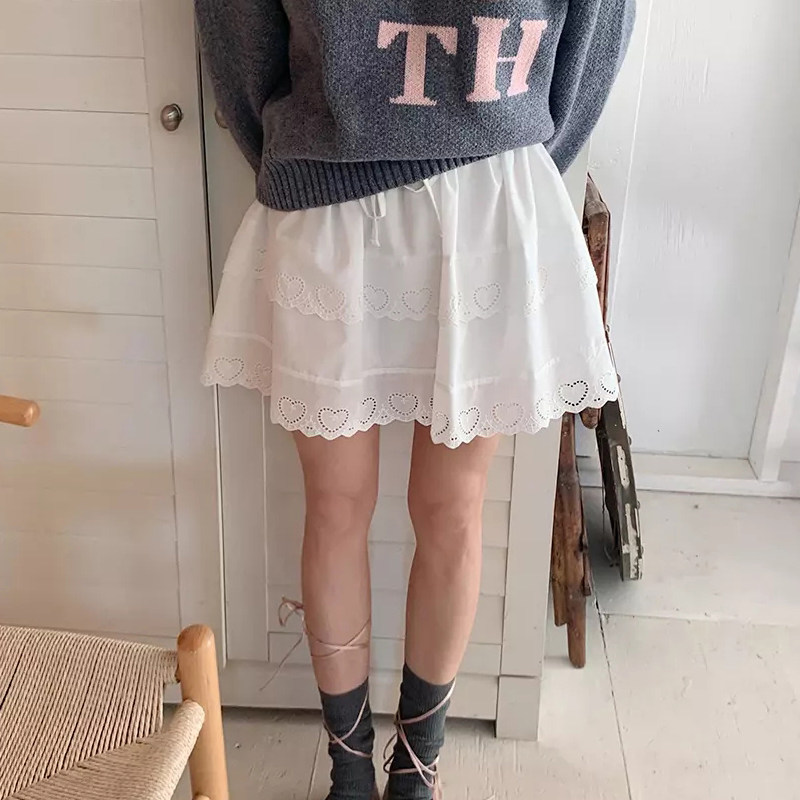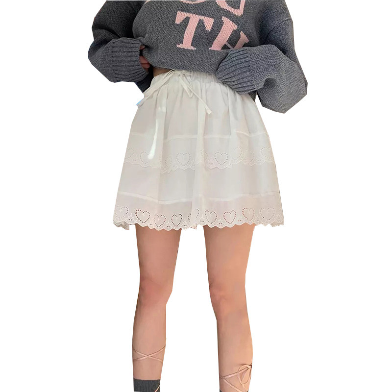2025年韩版 高腰抽绳设计蛋糕裙花边刺绣半身裙白色小短裙 春夏新款