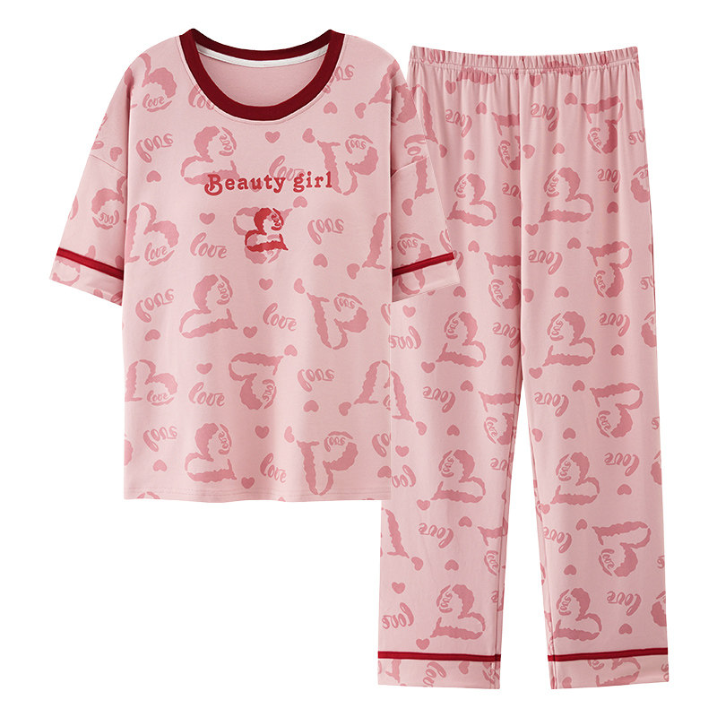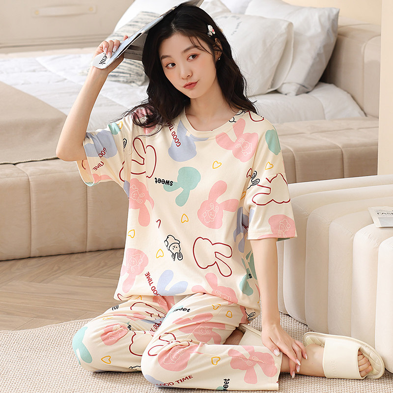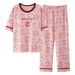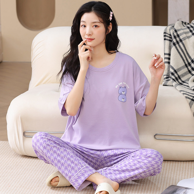 长裤 短袖 纯棉薄款 加肥加大码 睡衣女夏季 卡通家居服套装 2024年新款