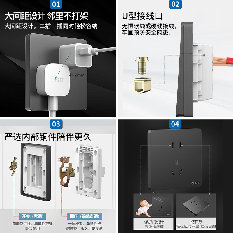 正泰开关插座面板家用墙壁黑灰色暗装 三孔86型5孔usb一开双控五孔