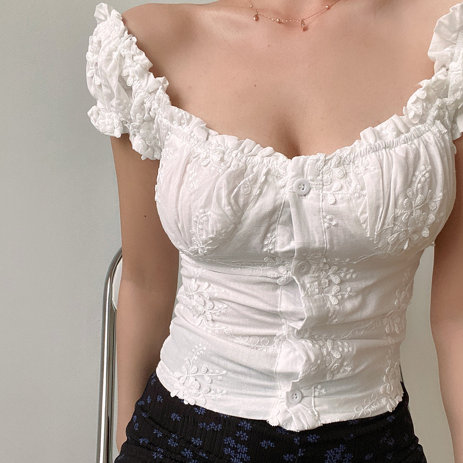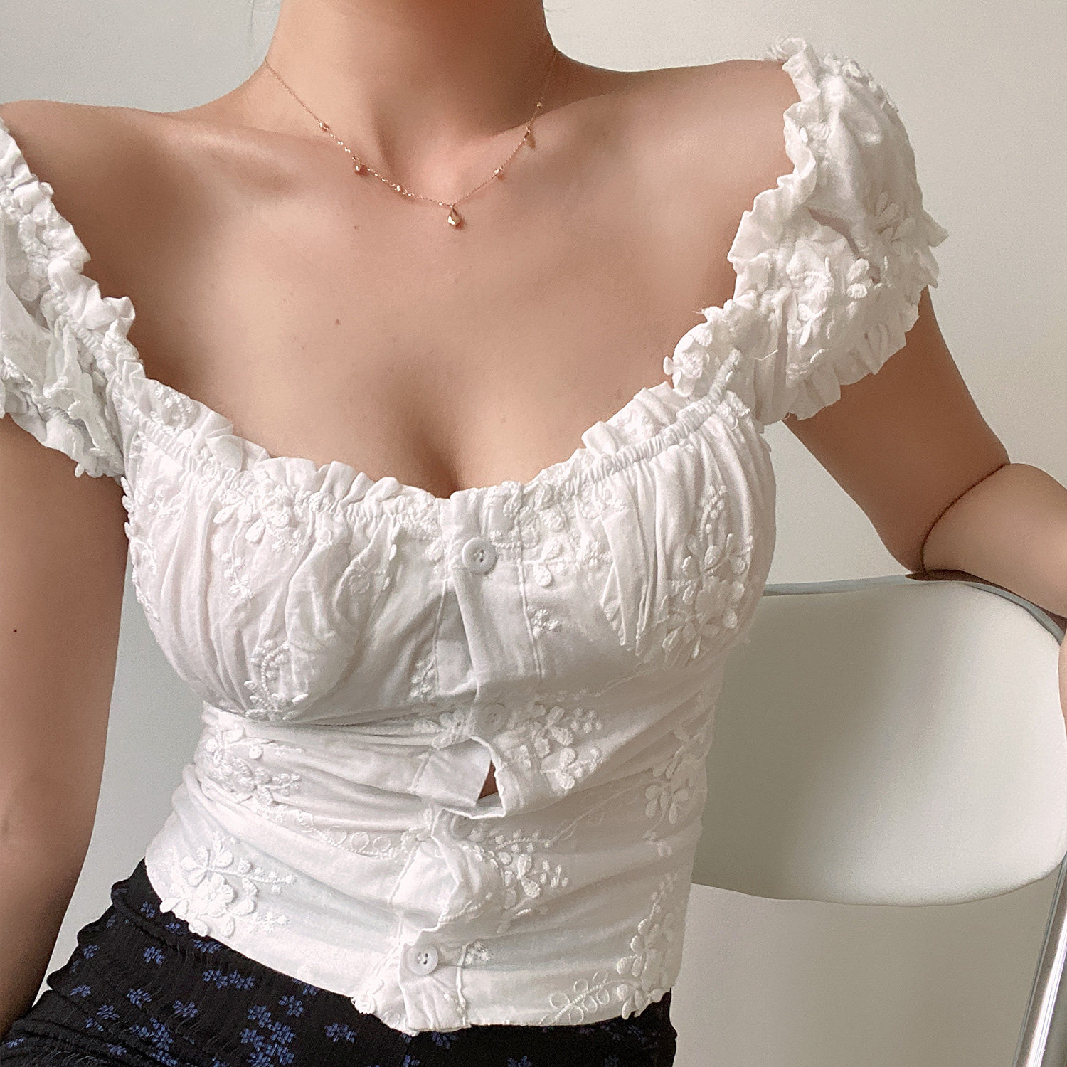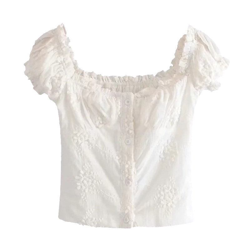 衬衫 BERAN 白色短袖 收腰泡泡袖 上衣女 复古U领木耳边立体绣花修身