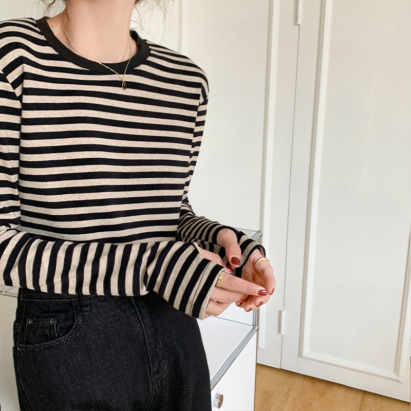 修身 棉质打底衫 条纹长袖 新品 T恤上衣潮 t恤女秋季 小众腔调感