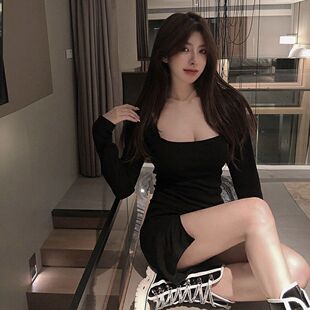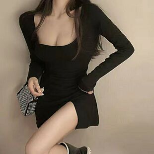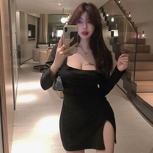 显瘦小开叉包臀连衣裙 气质方领修身 加绒性感打底短裙女装 2022新款