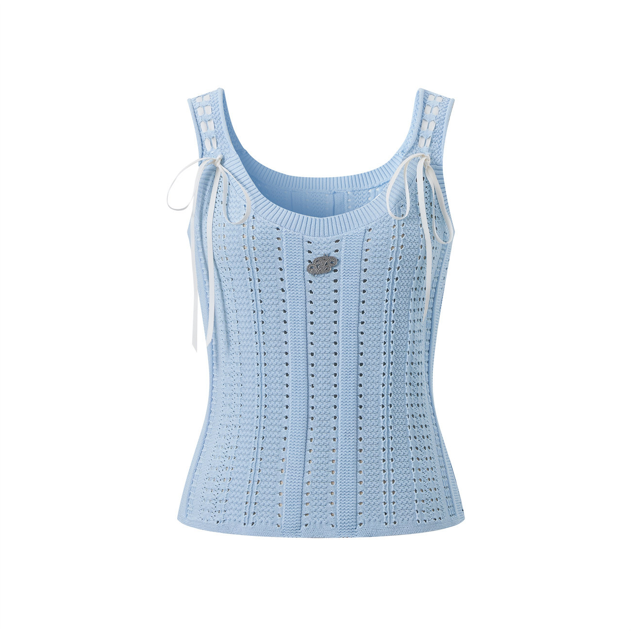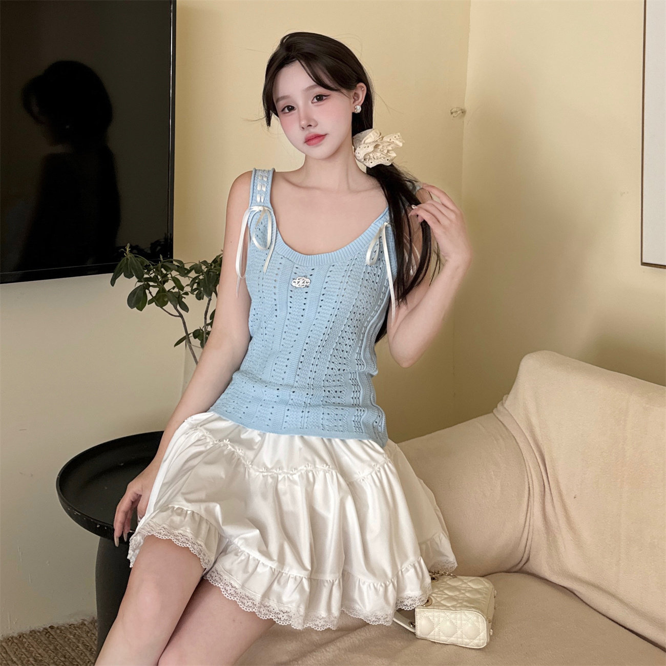 Three 24新蓝色蝴蝶结镂空毛织背心花边芭蕾半身裙木兰 Quarters
