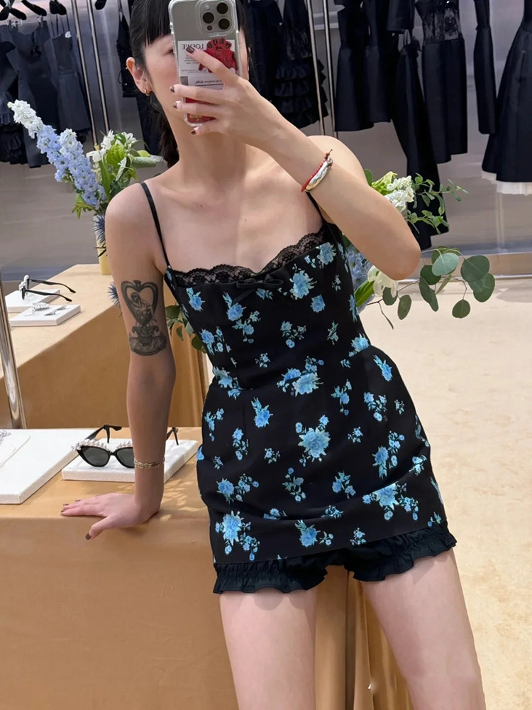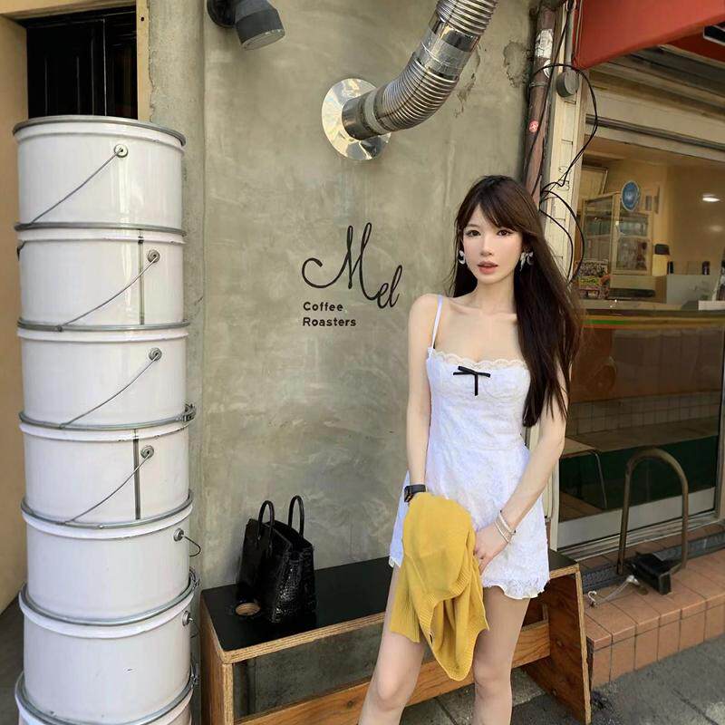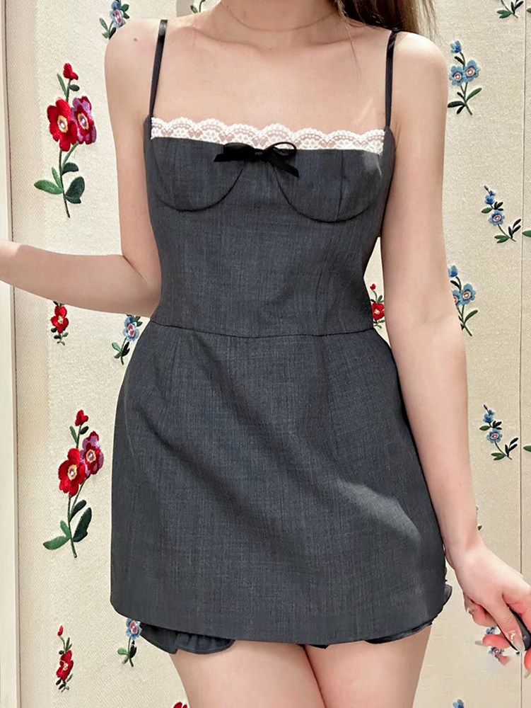 shushu蕾丝边饰混纺拼接双层吊带连衣裙蝴蝶结收腰显瘦A字裙子