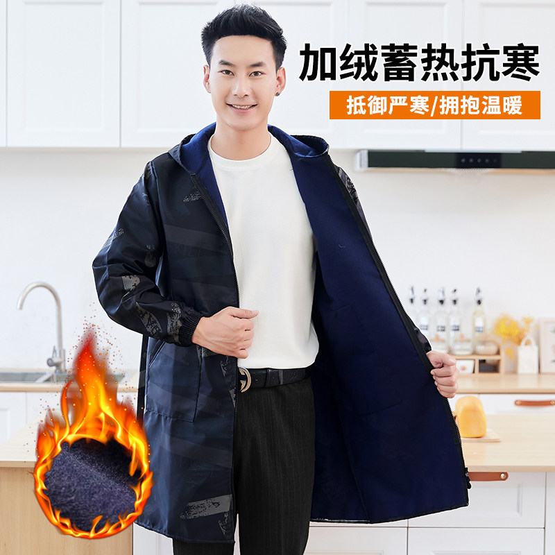 加绒罩衣加厚外套男女拉链中长款 围裙保暖工作服 厨房防水防油长袖