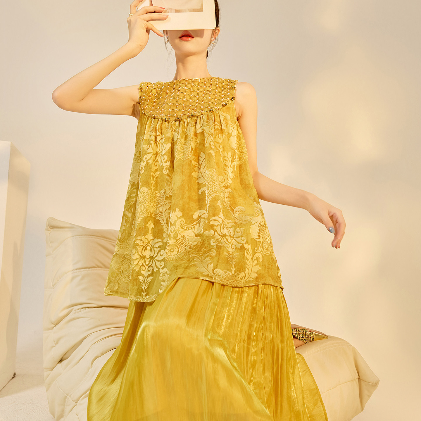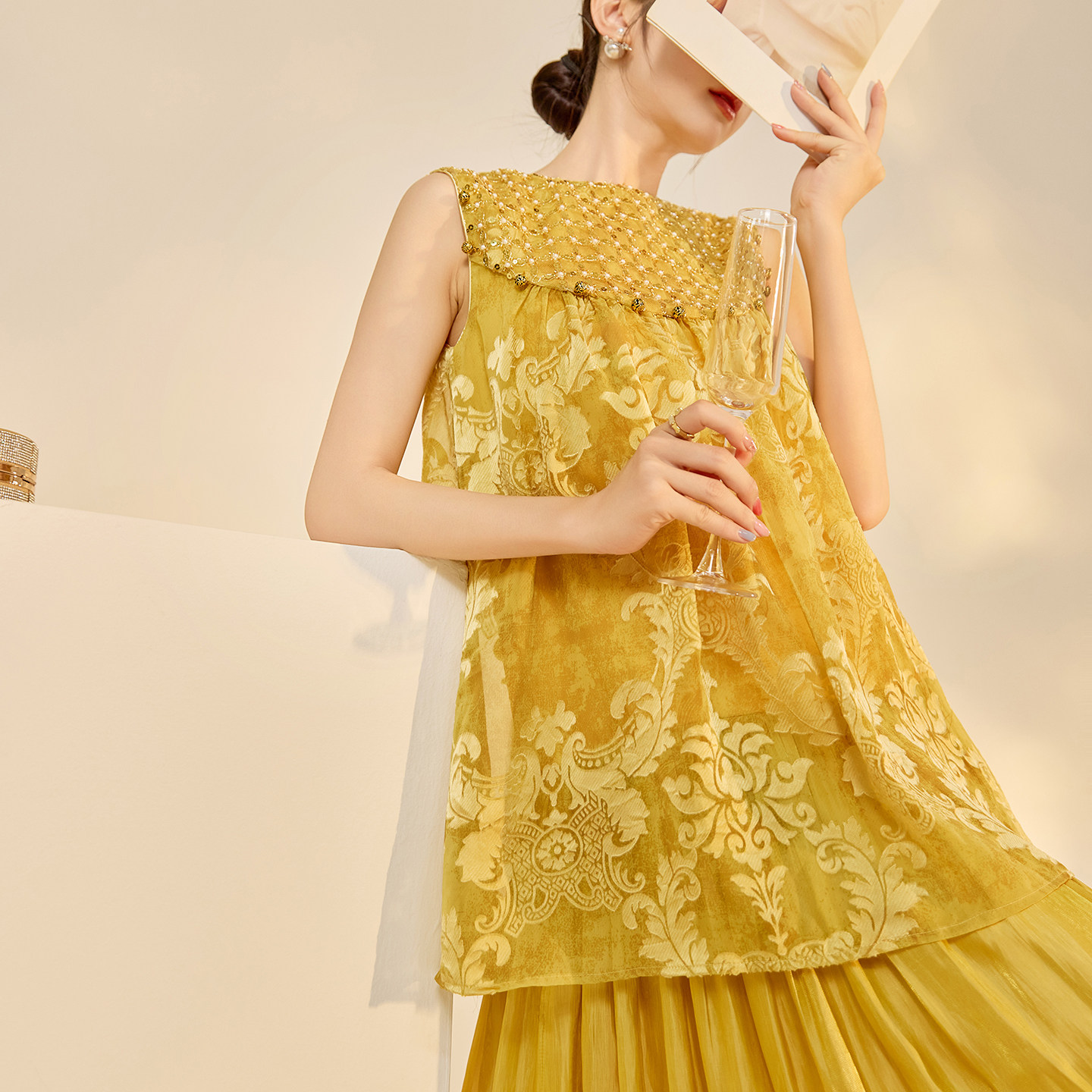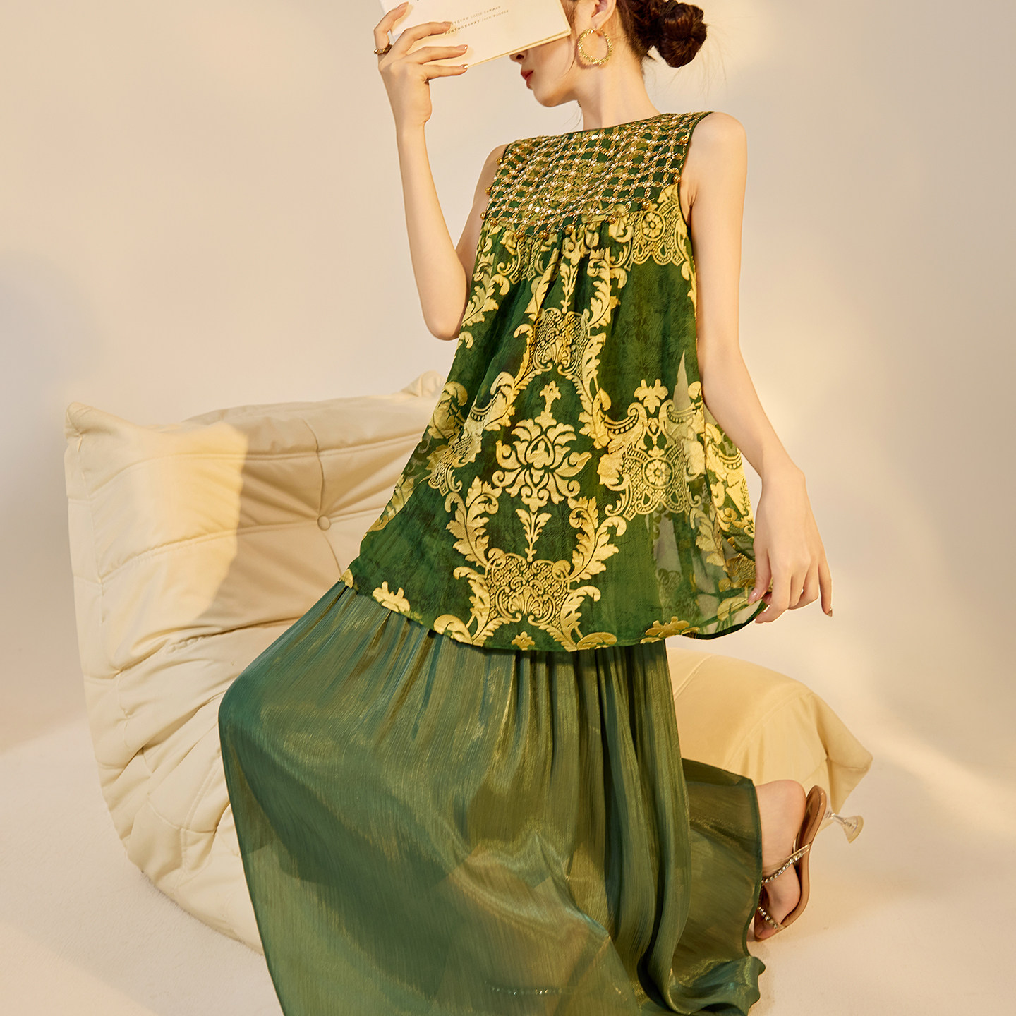 长裙女高端拼接气质连衣裙 复古珠片人丝无袖 N6041 轻国风版 新中式