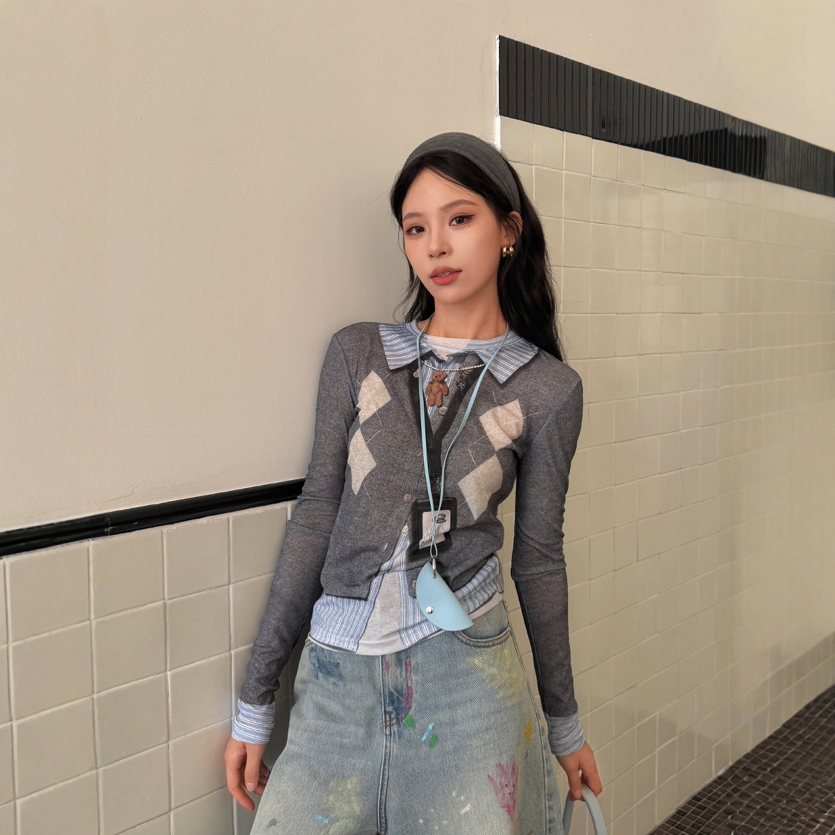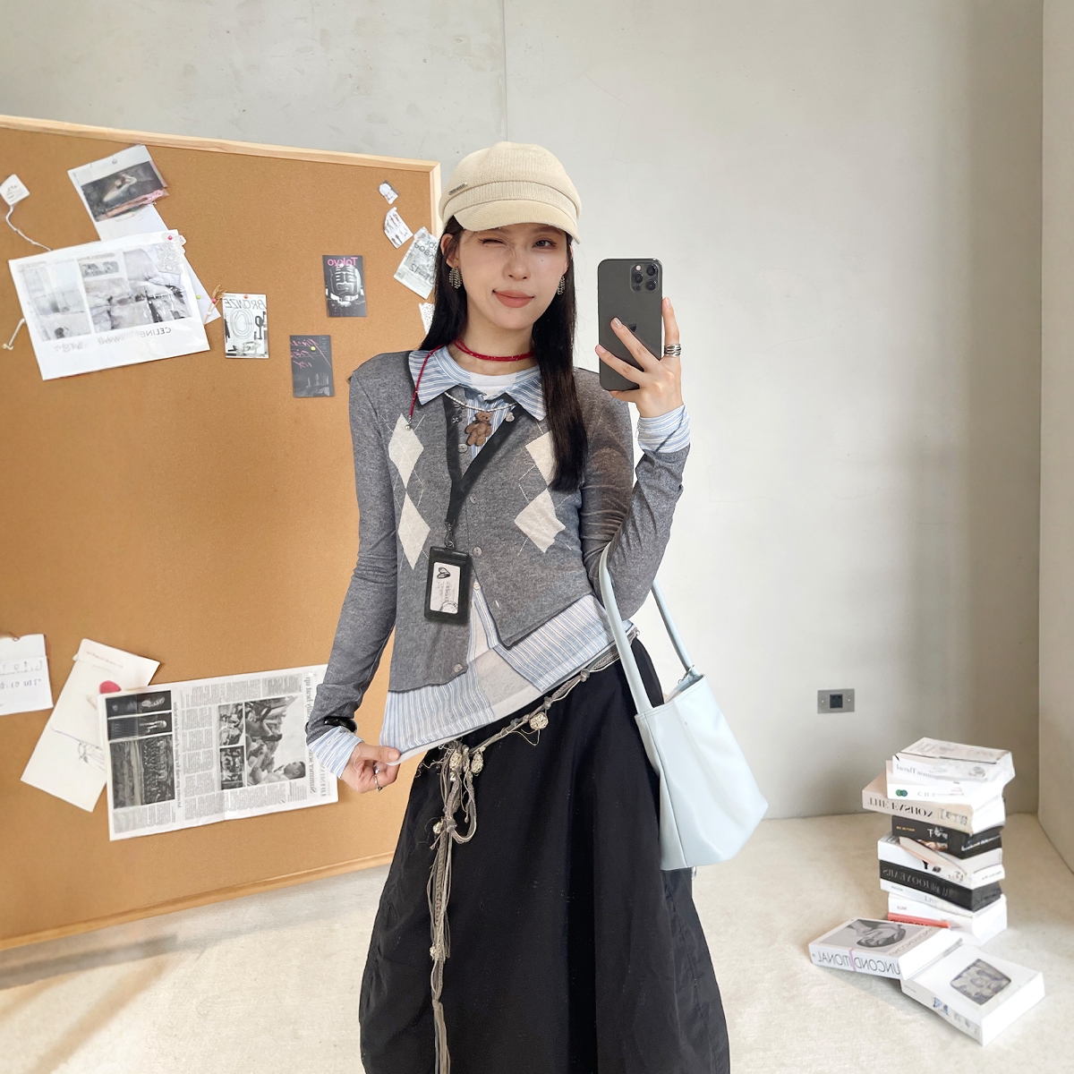 FORDARE设计师品牌趣味假两件3D印花工牌菱格打底衫 沈梦辰同款