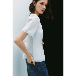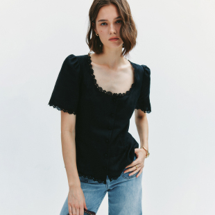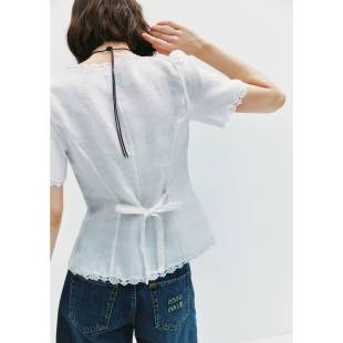 复古蕾丝拼接系带收腰衬衫 法式 1OO%亚麻 衬衣女 宫廷小蛮腰