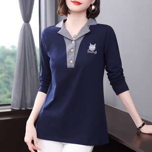 上衣内搭女士打底衫 纯棉翻领长袖 妈妈中长款 2025春秋新款 t恤女装