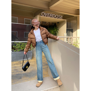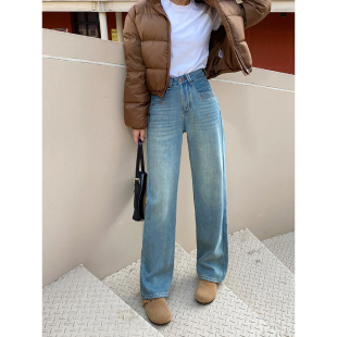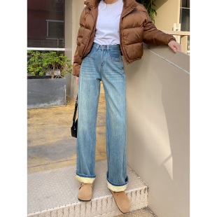 女秋冬宽松垂感直筒长裤 阔腿牛仔裤 加厚绒保暖高腰窄版 软糯亲肤