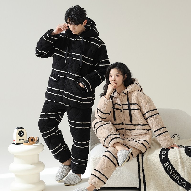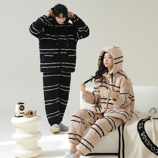 情侣家居服套装 加厚加绒保暖睡衣女士男冬季 开衫 长裤 法兰绒长袖