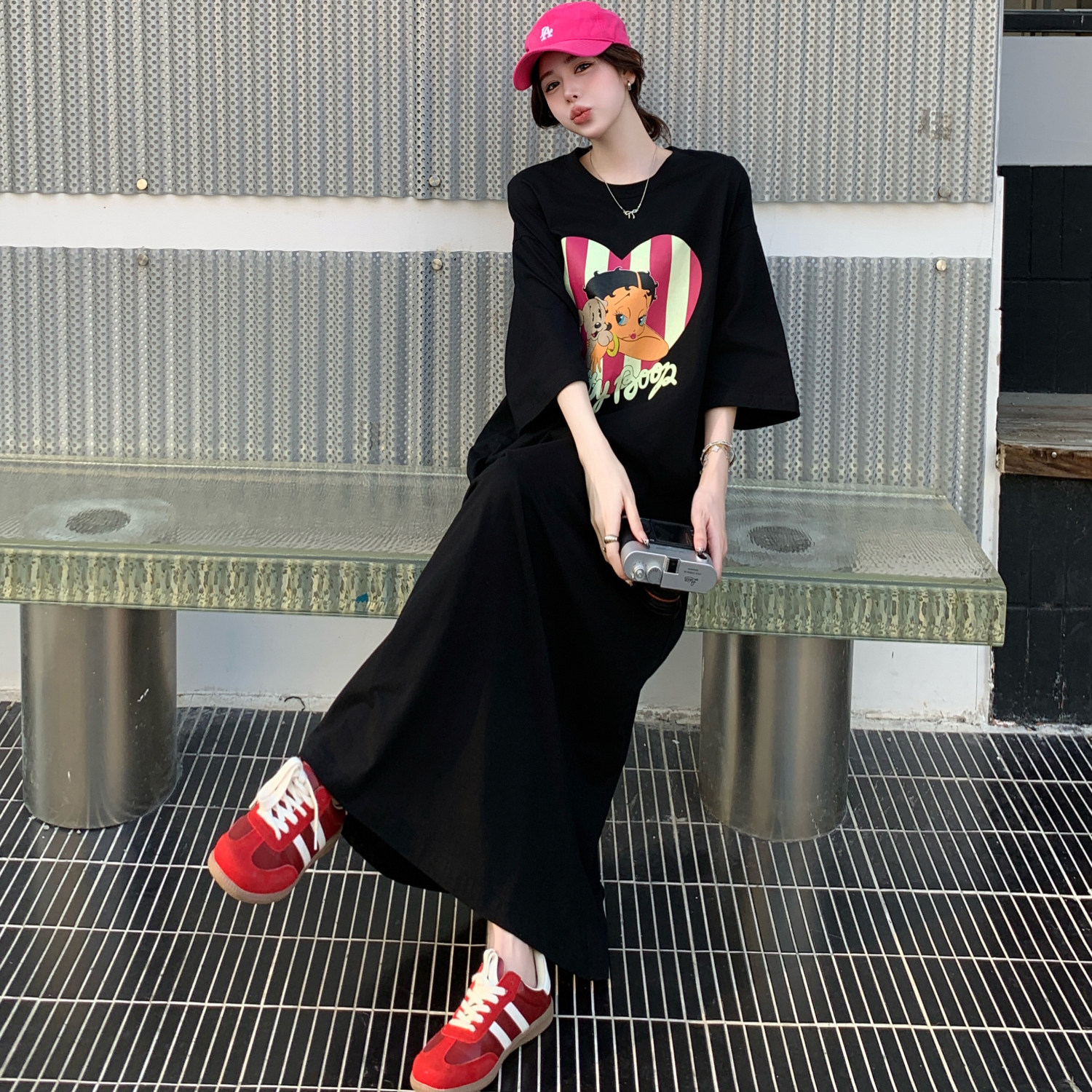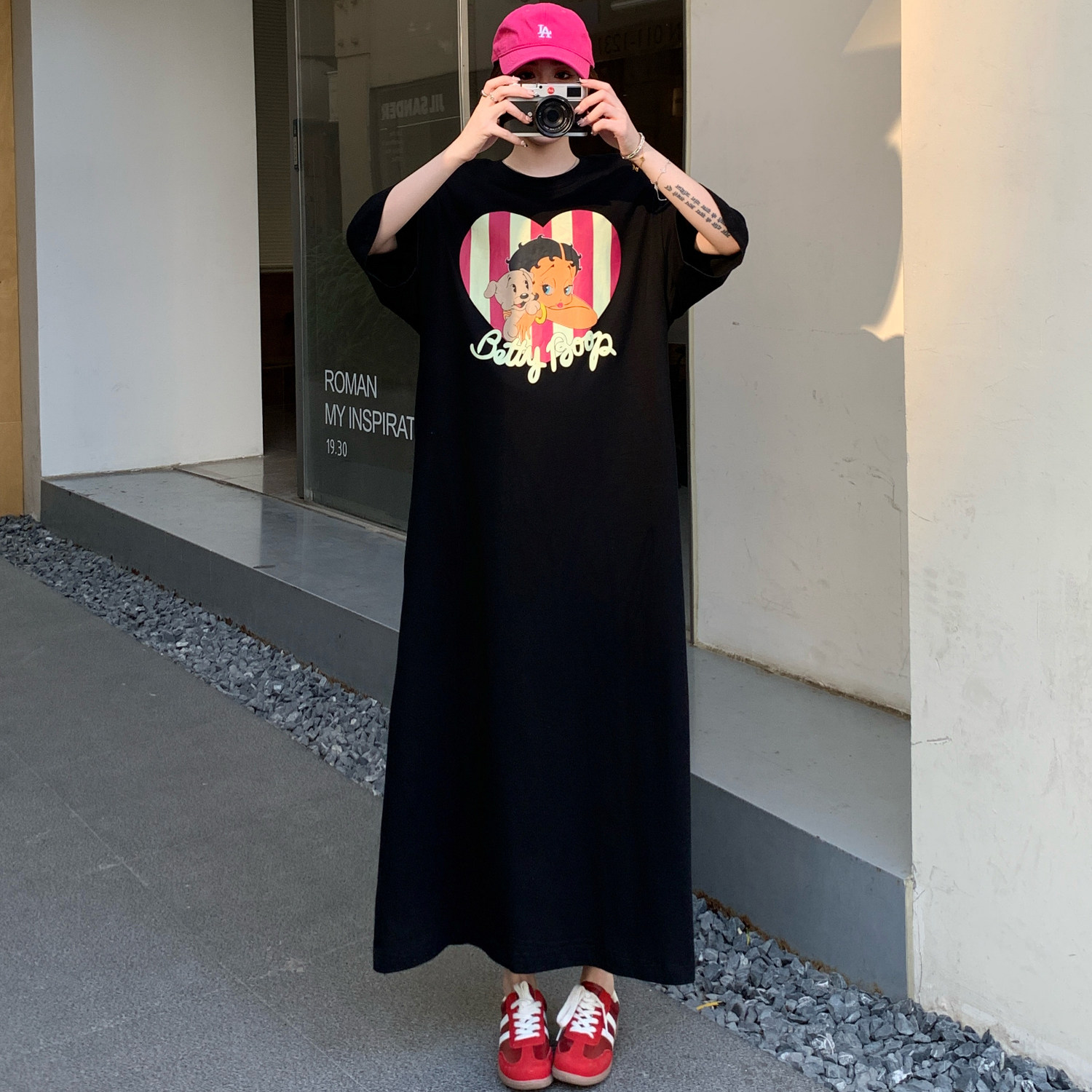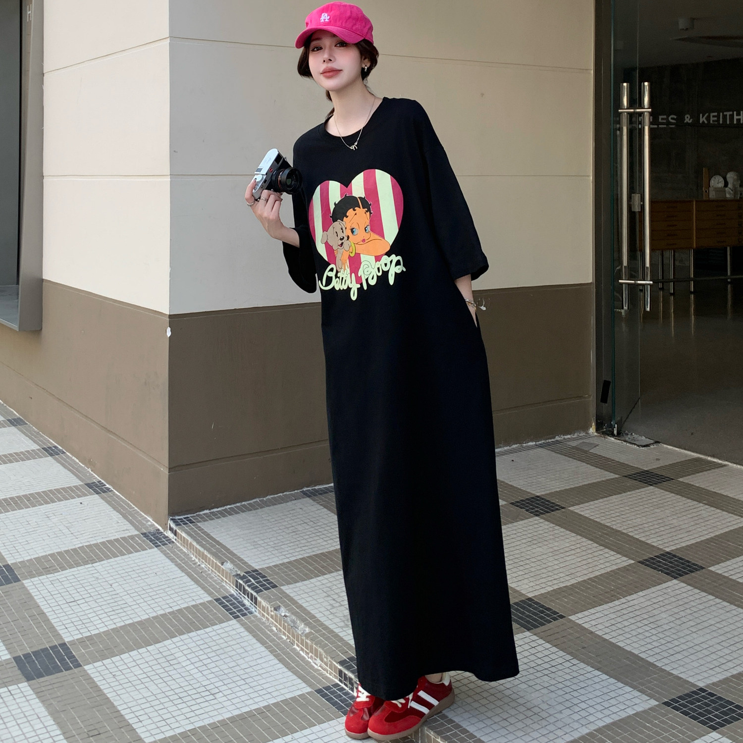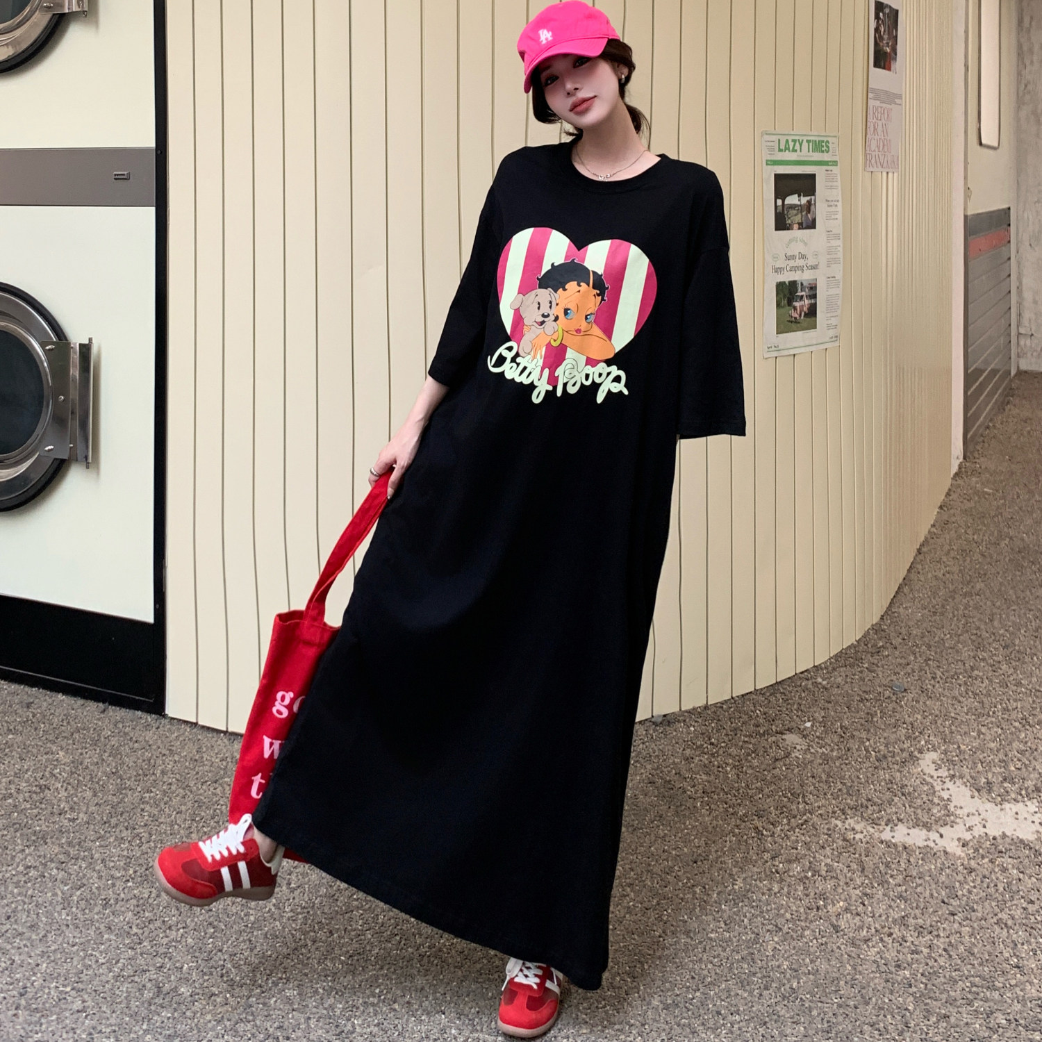 卡通印花宽松慵懒风t恤长裙子胖mm夏新款 连衣裙 遮肉休闲过膝短袖