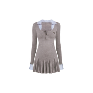 Mess 辣妹高级感收腰显瘦假两件灰色U领灰色连衣裙女春秋 Studio