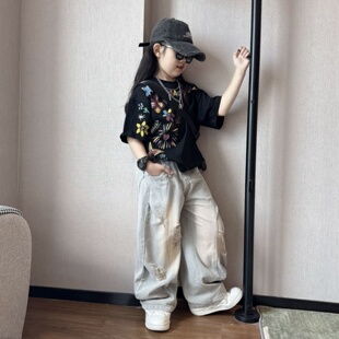 蝴蝶绘画短袖 中大童韩版 两件套 牛仔破洞弯刀裤 痞帅潮酷男女童薄款