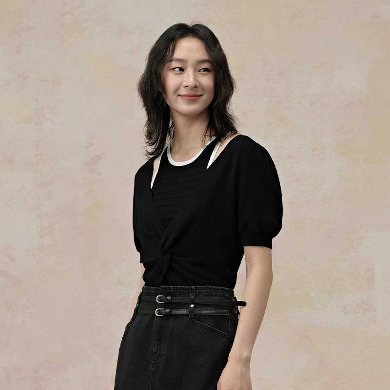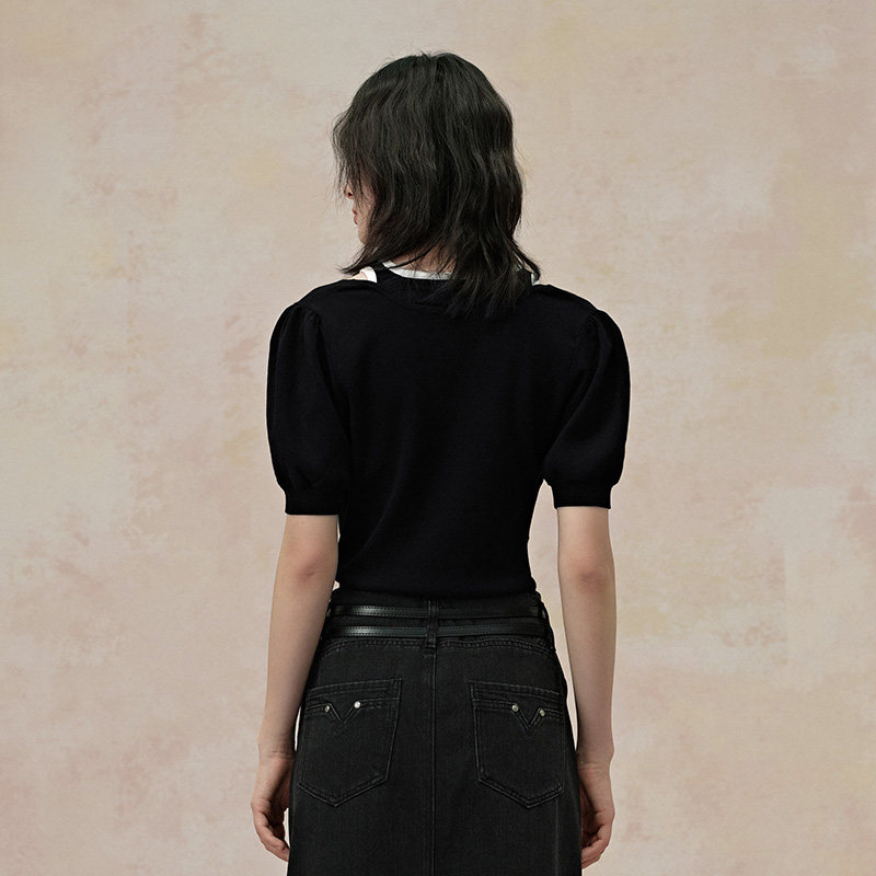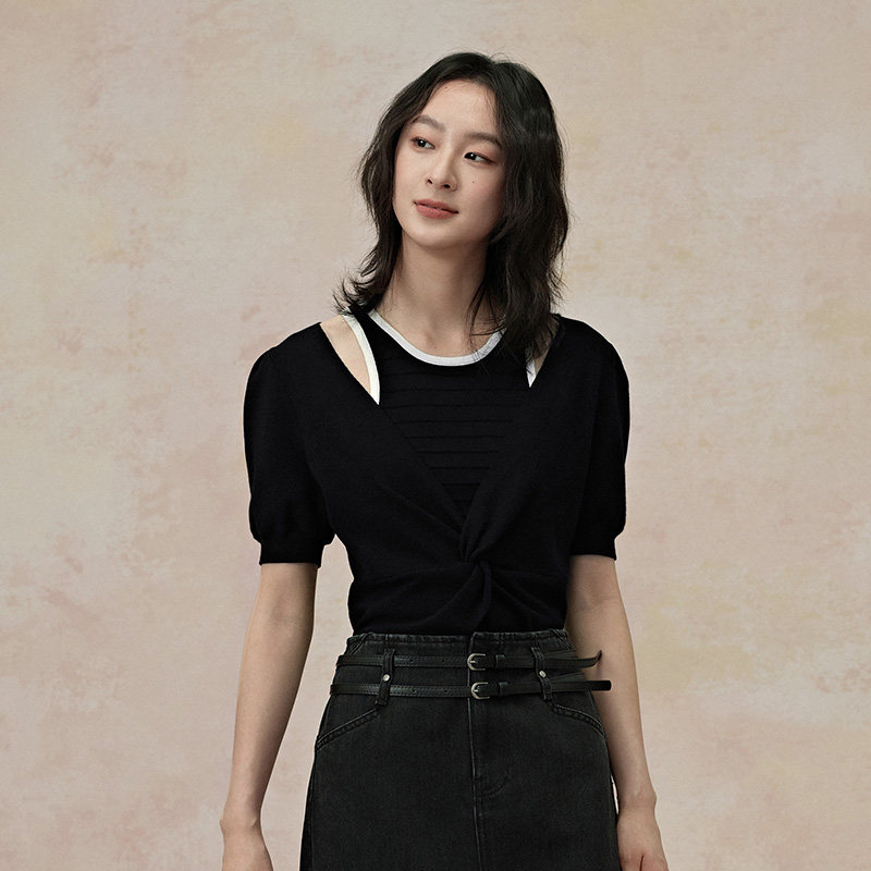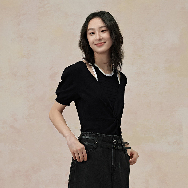 透气上衣 女2025夏薄款 PIT复古撞色拼接假两件露肩短袖 T恤针织衫
