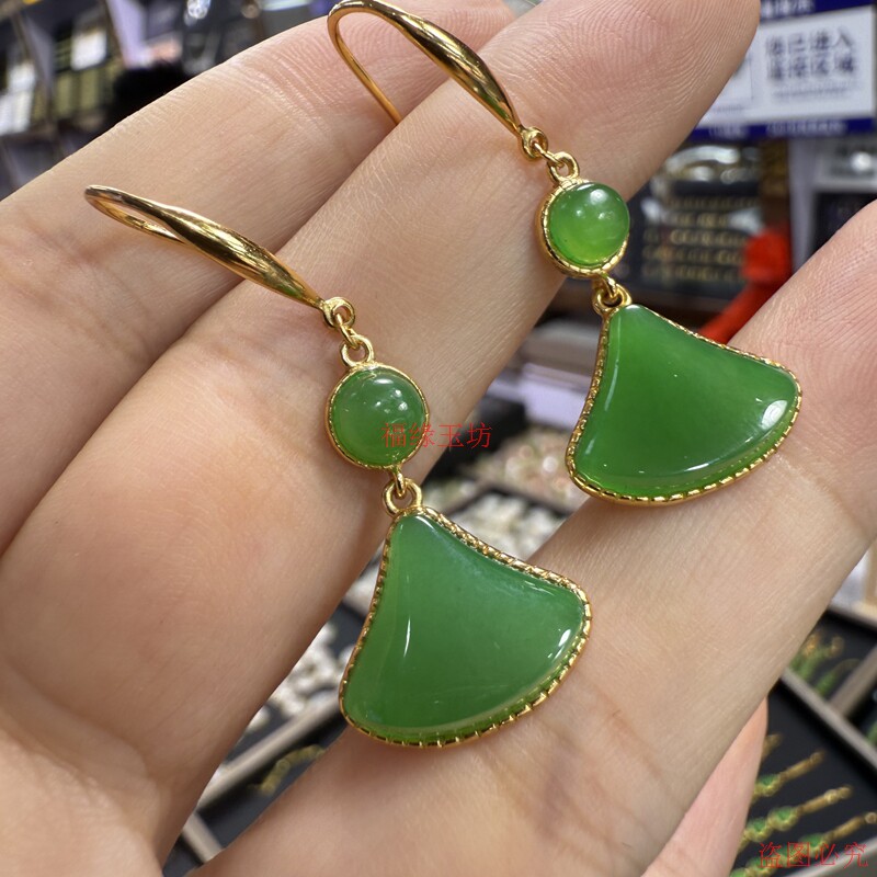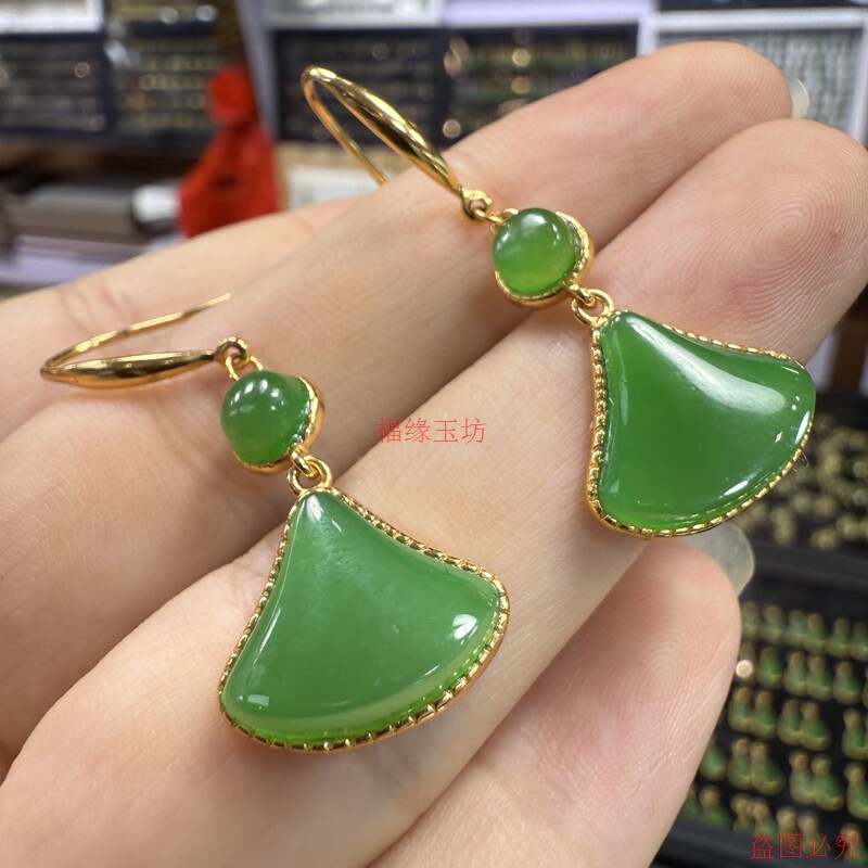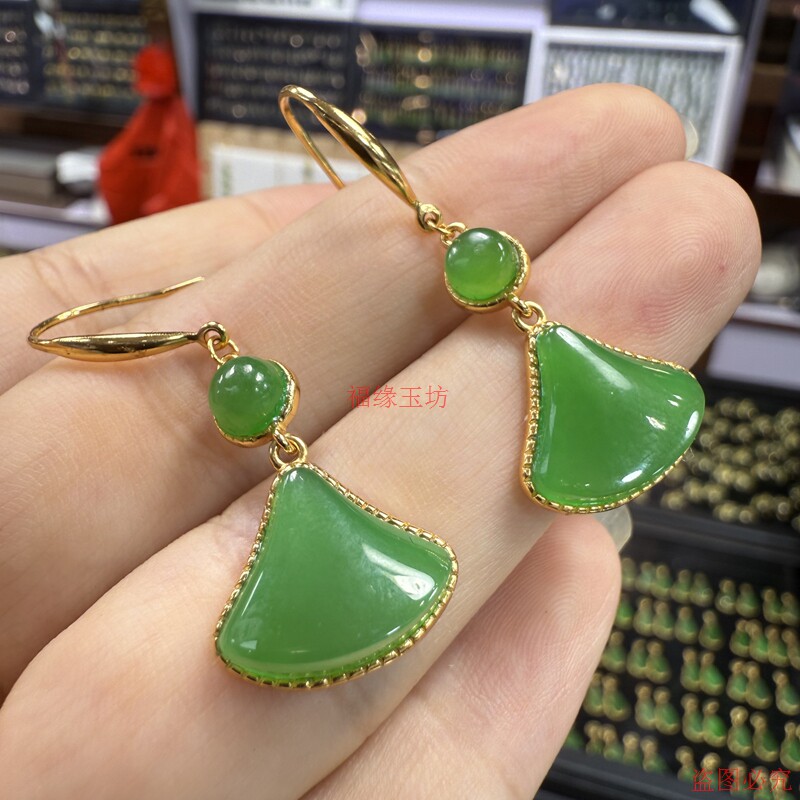 精品和田玉耳坠碧玉小巧设计叶子耳环18k镀金镶嵌小裙子玉石耳饰