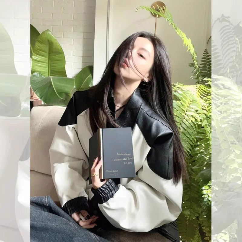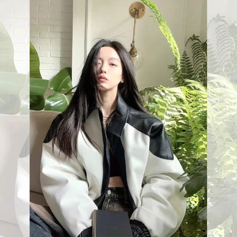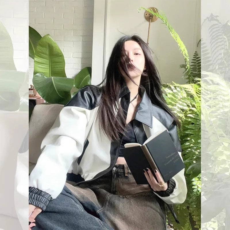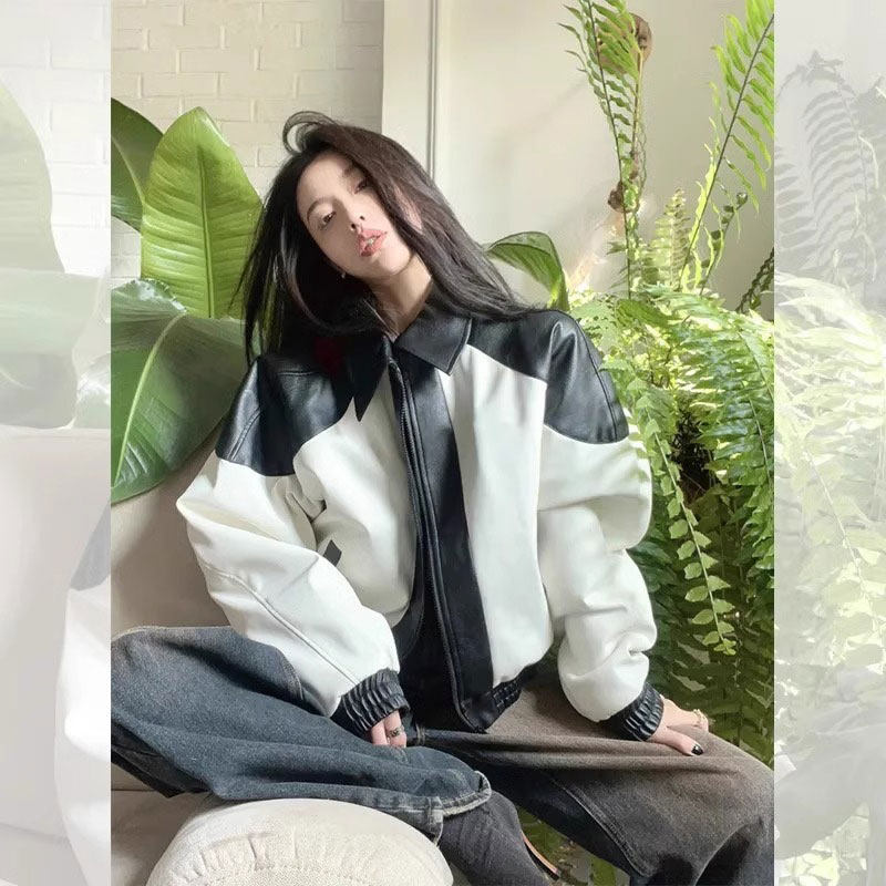 美式 复古黑白皮衣机车外套女2024今年流行高级感棒球服夹克上衣潮
