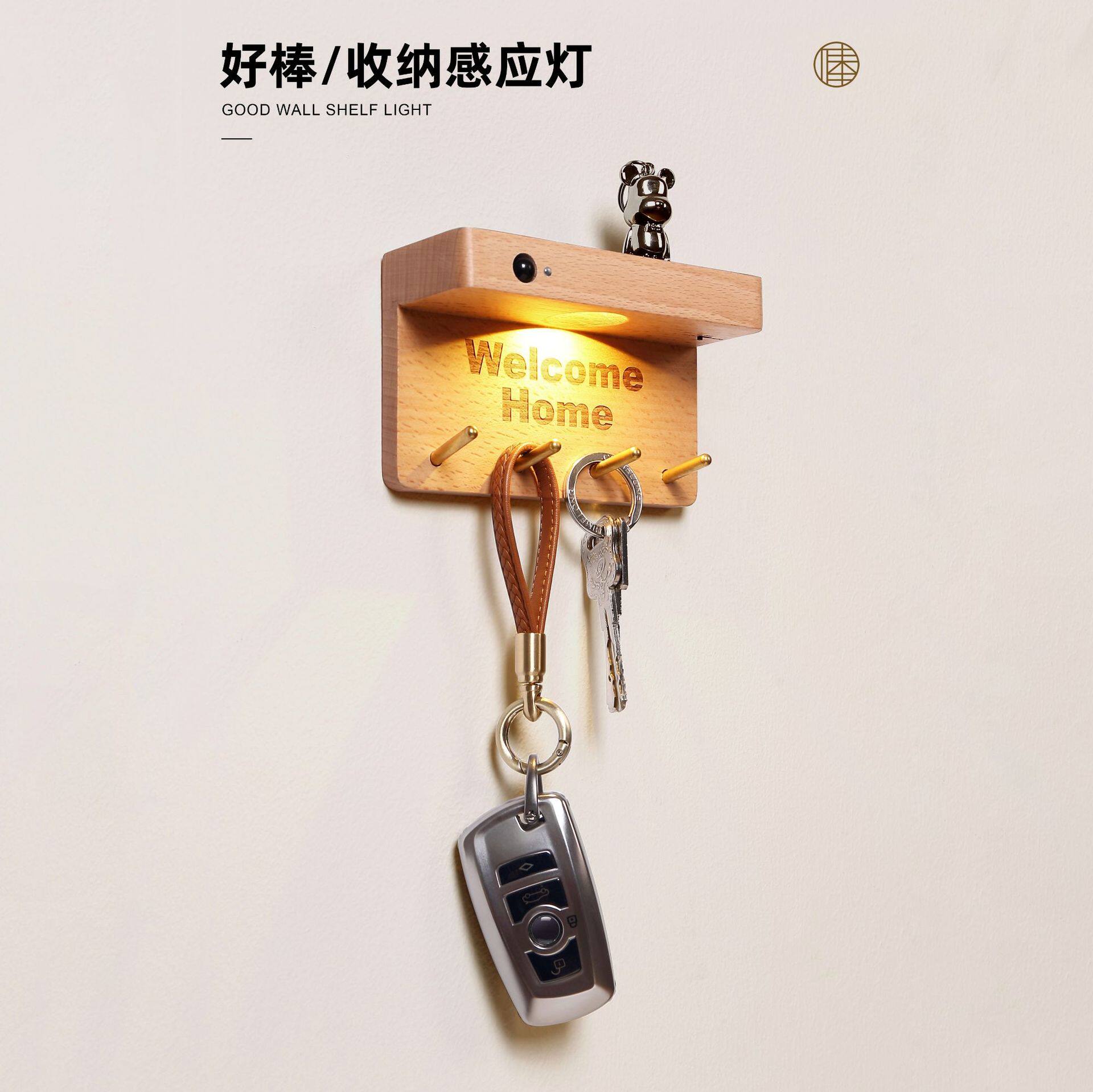 好棒入户花园灯 钥匙挂勾收纳灯免布线 人体感应灯壁灯实木小夜灯